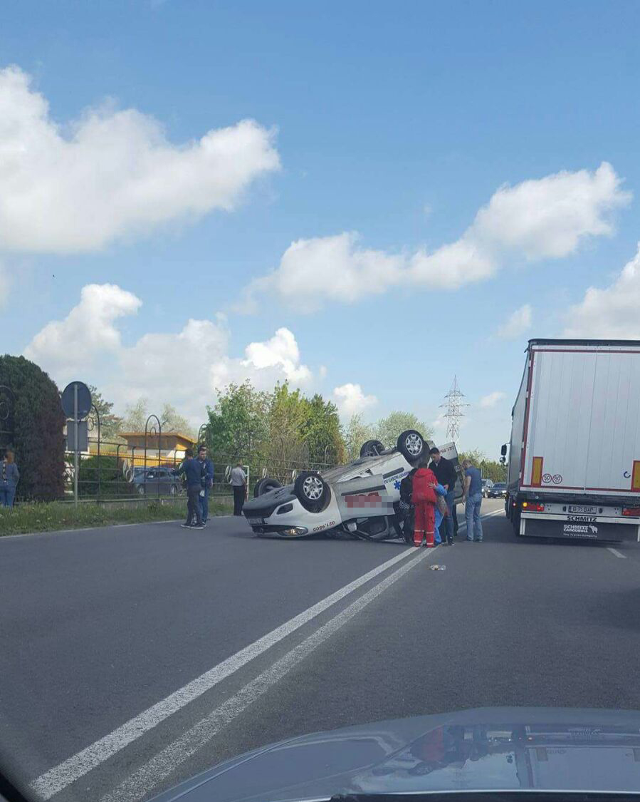 Un șofer aflat în trafic a surprins imaginile cu autoutilitara răsturnată pe șosea și a postat fotografiile pe un grup de pe Facebook pentru a-i anunța pe alți conducători auto să evite pe cât posibil zona, unde deja se formează coloane de mașini.