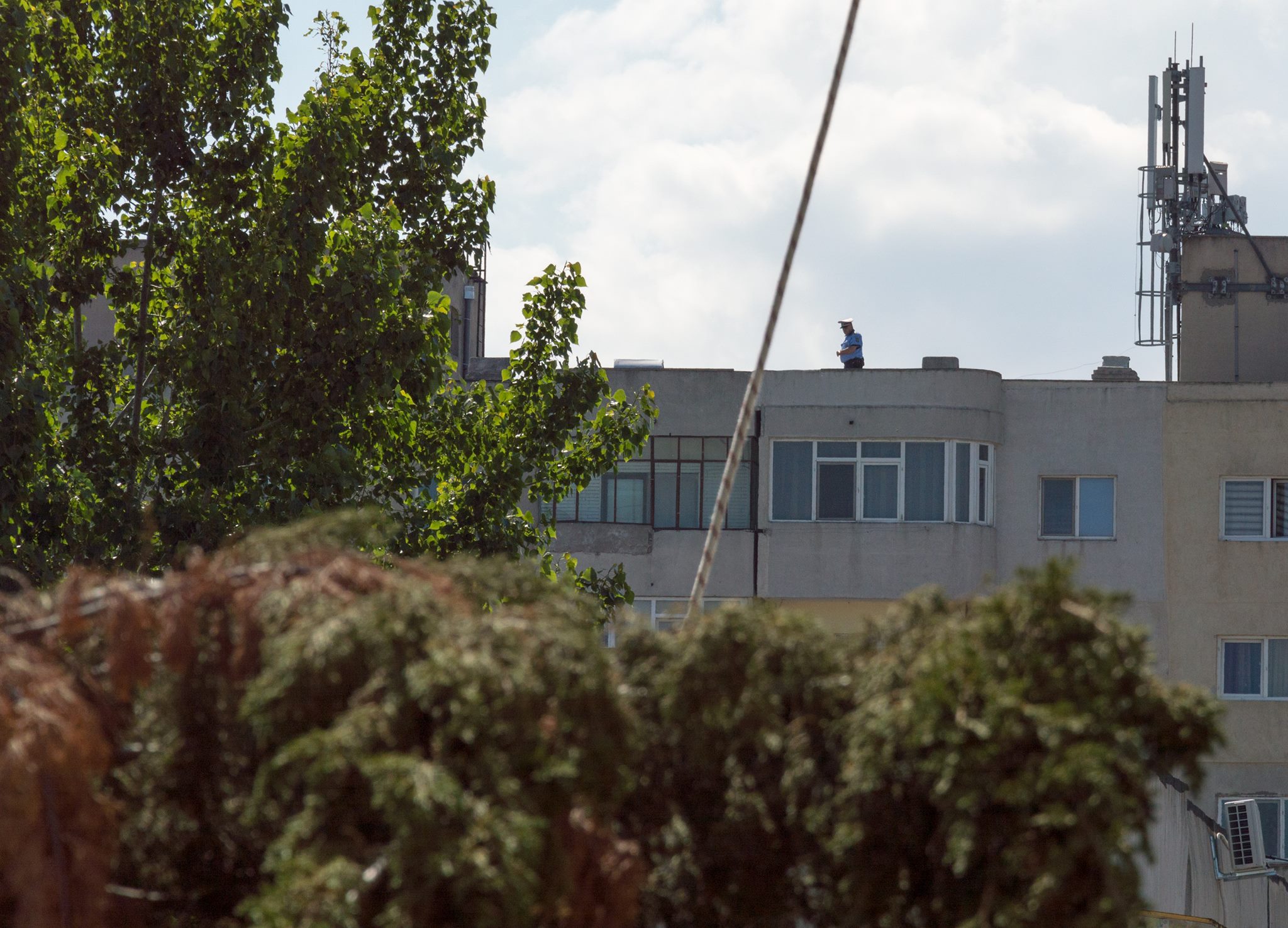 Potrivit unor informații, un polițist a urcat pe bloc și negociază cu cel care amenință că se sinucide prin telefon.