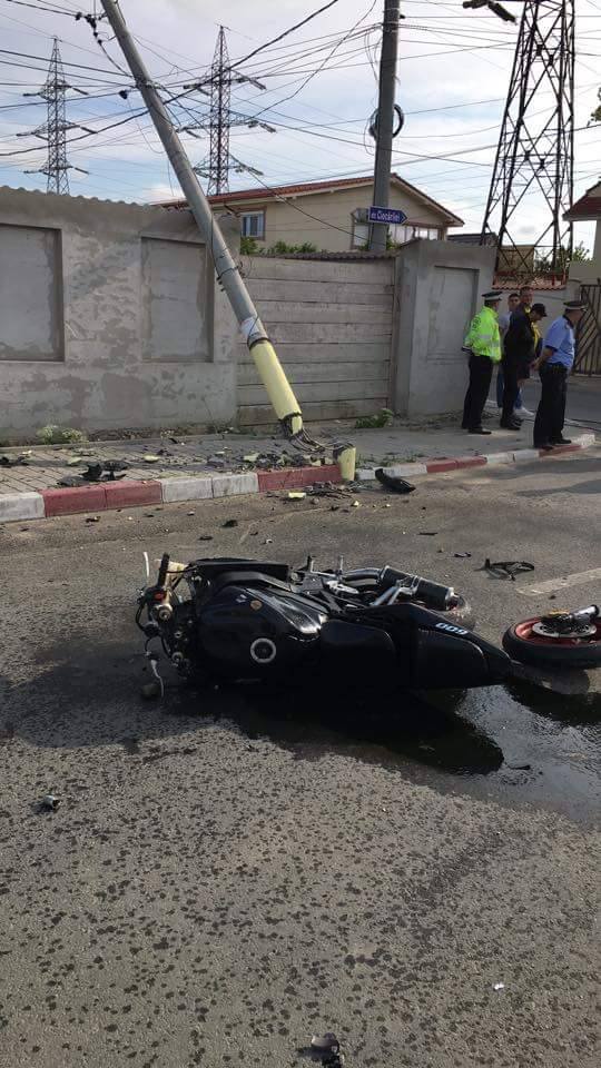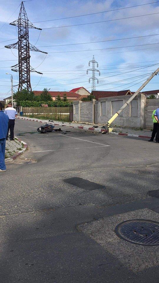 Accident spectaculos în Năvodari! Un motociclist s-a izbit violent de un stâlp, pe care a reușit să îl și doboare! Aceasta după ce individul a refuzat să oprească la semnalul unui echipaj al Poliției Năvodari!