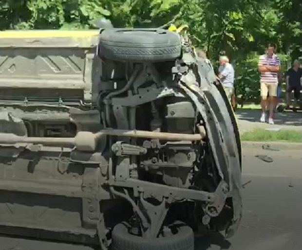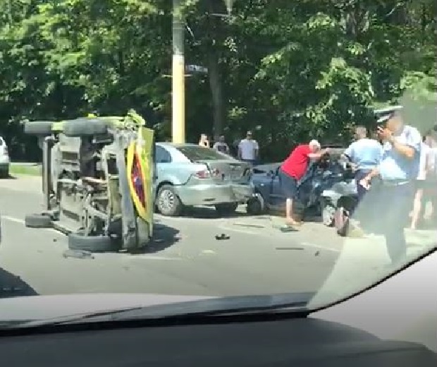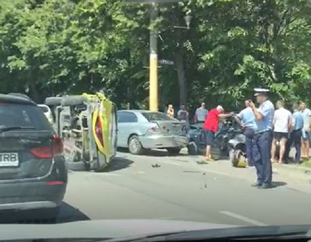 În urma impactului un taxi s-a răsturnat, iar alte două mașini au fost serios avariate. La fața locului s-a deplasat și un echipaj de poliție pentru a stabili toate împrejurările producerii accidentului.