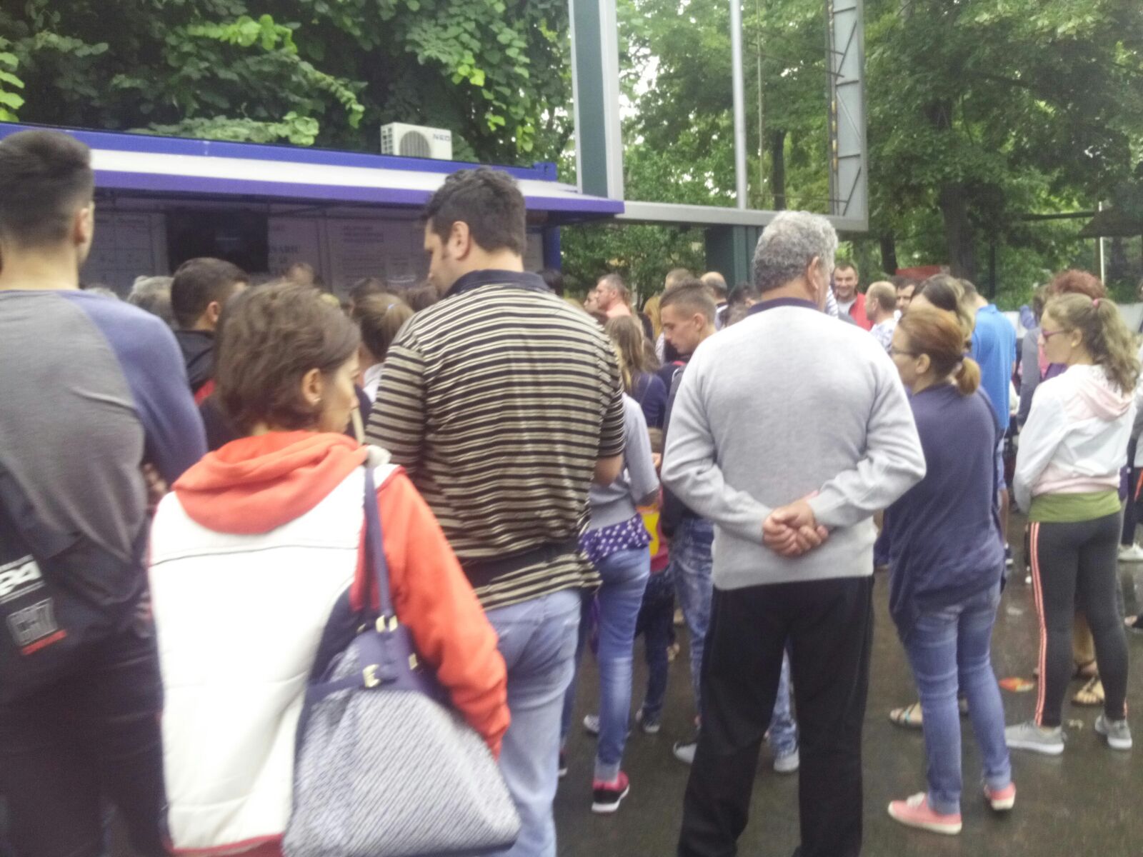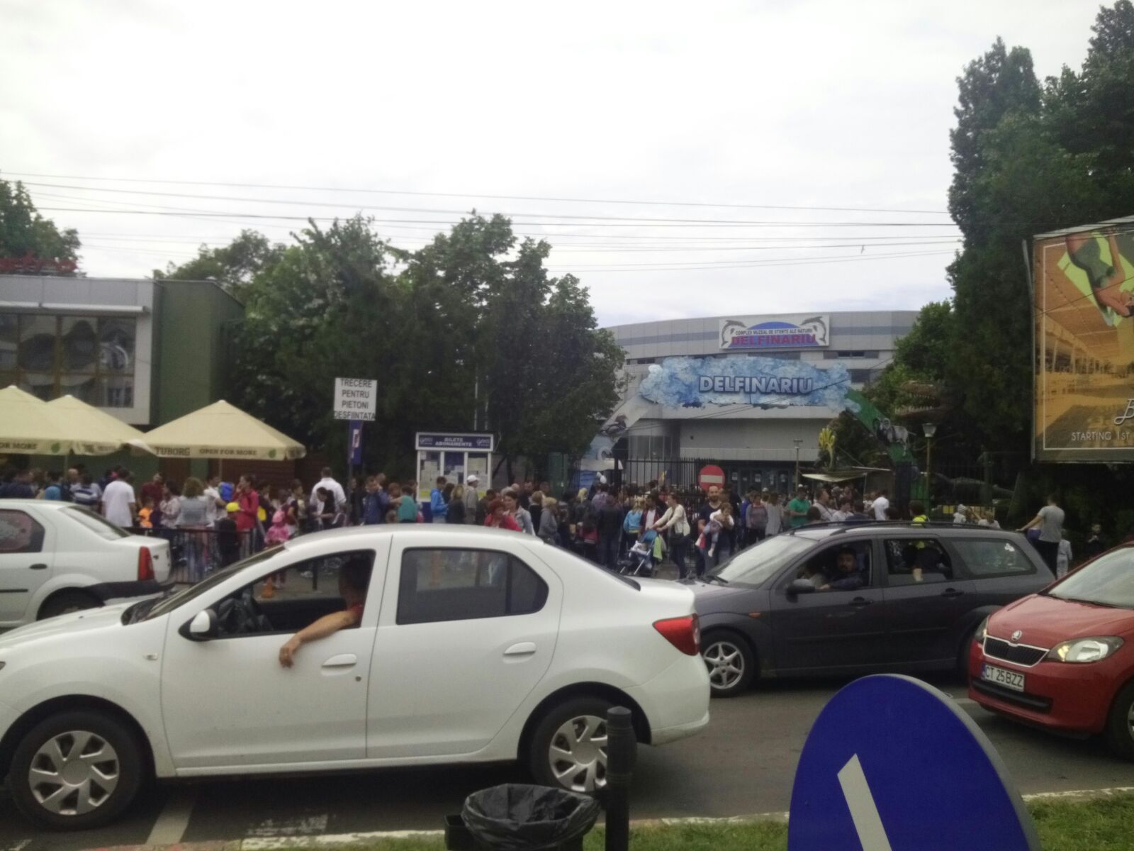 Mii de turiști alungați de pe plaje de vremea potrivnică au luat calea Delfinariului pentru a-și umple timpul. La orele amiezii, cozile la bilete erau de zeci de metri, așa cum se poate observa și din fotografii.
