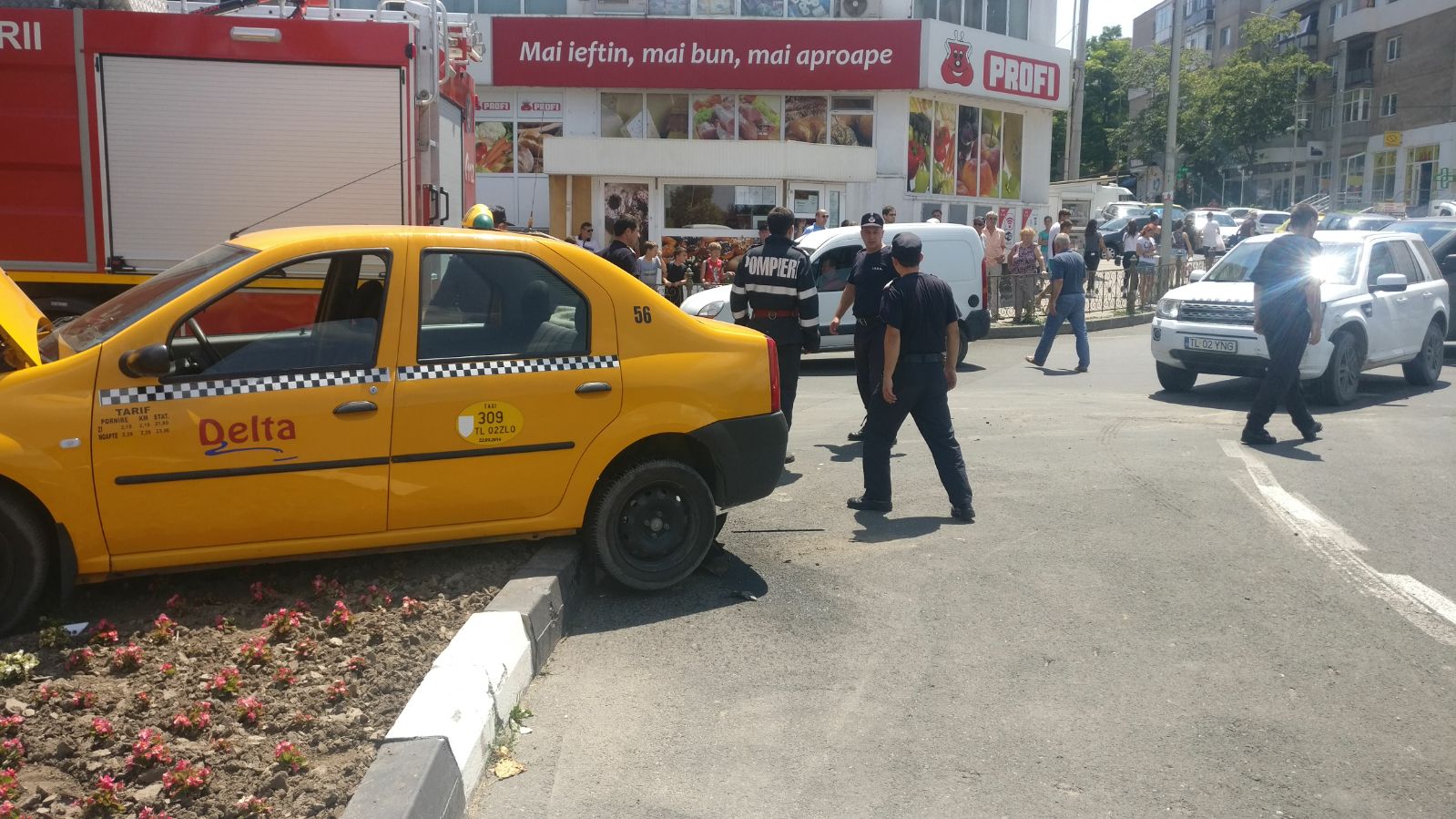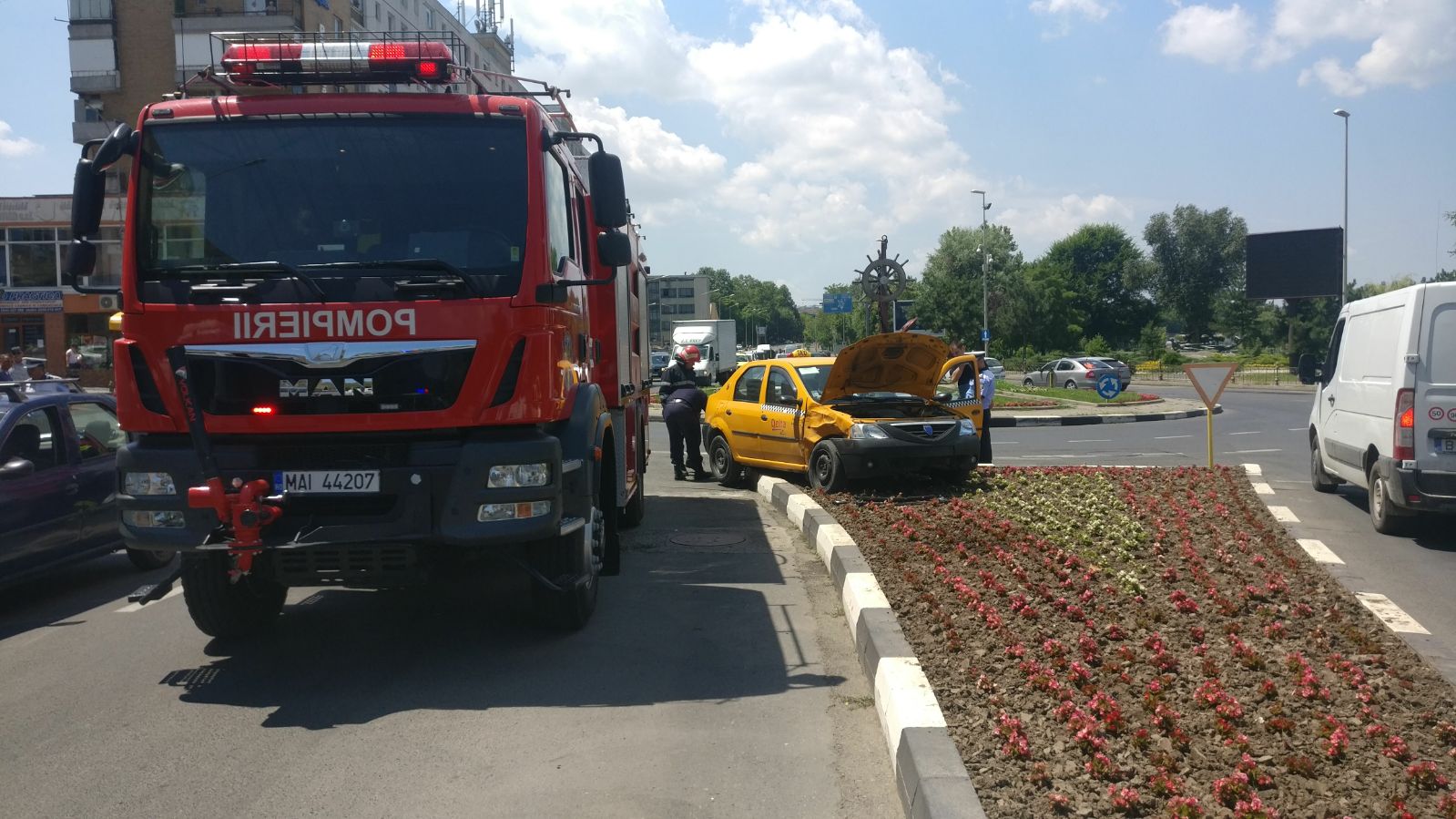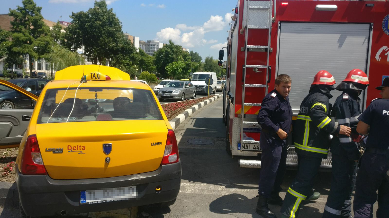 Pompierii militari din cadrul ISU Delta au fost solicitați să intervină astăzi pe strada Isaccei din municipiul Tulcea, unde un taximetrist a pierdut controlul volanului și s-a urcat cu mașina pe un scuar.