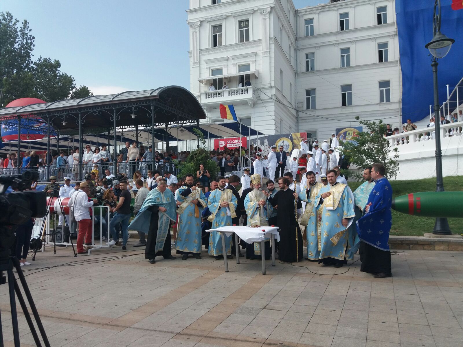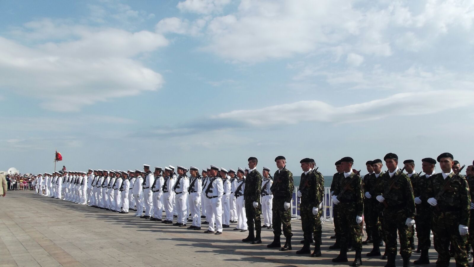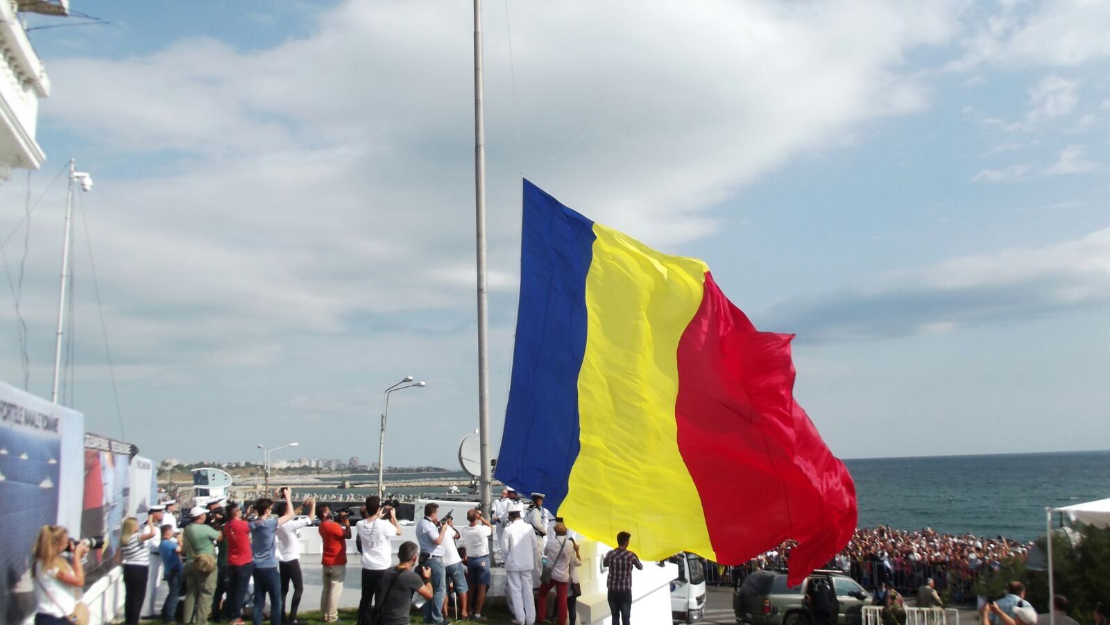 La începutul spectacolului, pe catargul de pe faleză a fost ridicat cel mai mare drapel de la malul Mării Negre, iar la bordul navelor, militarii vor arbora pavilionul, geacul și Marele Pavoaz.