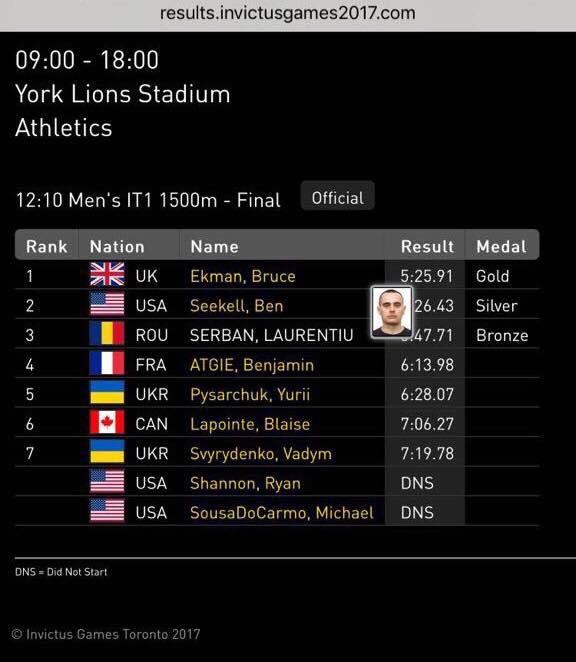 Maiorul Laurenţiu Şerban a câştigat bronzul în cursa de atletism de 1.500 de metri la Jocurile Invictus 2017 de la Toronto.