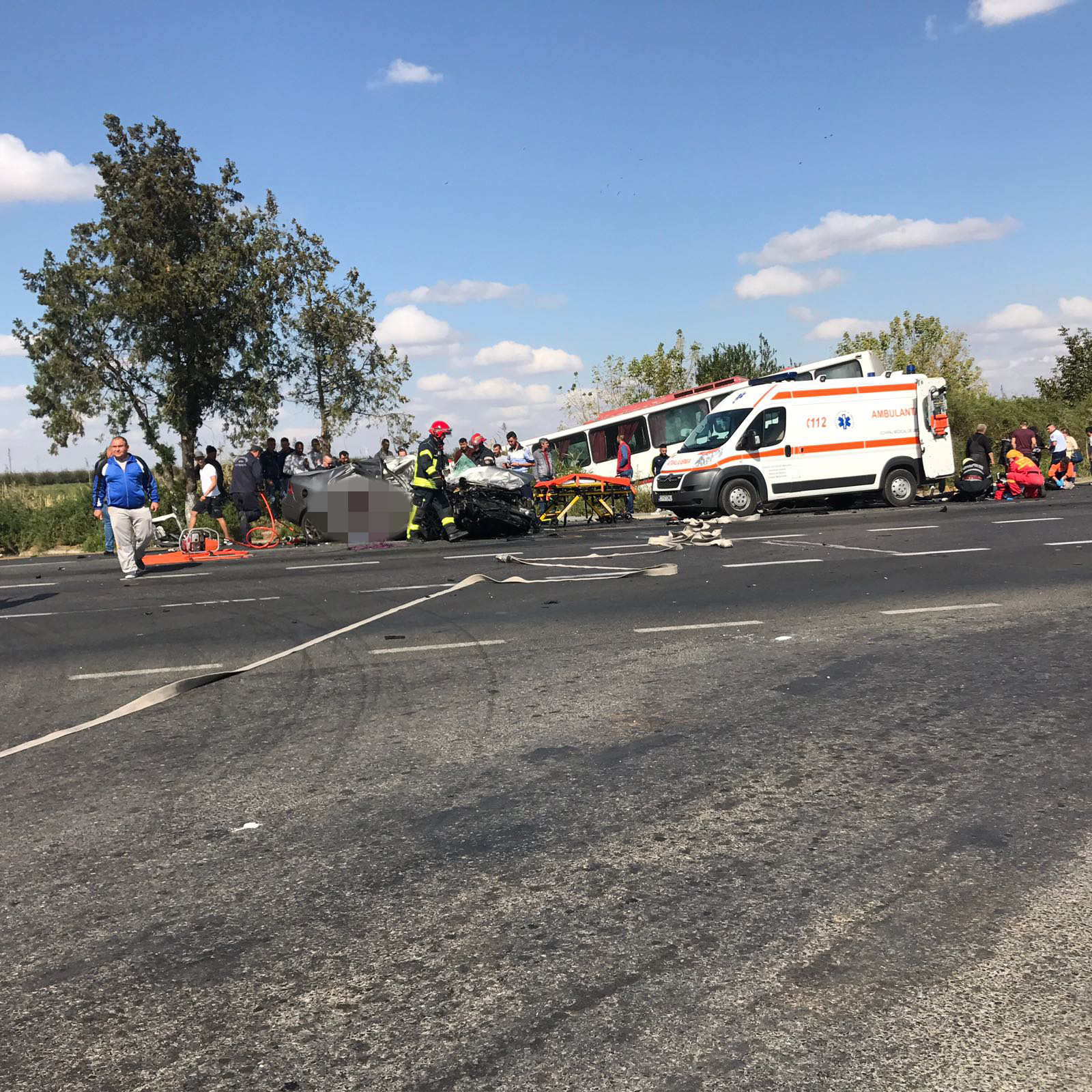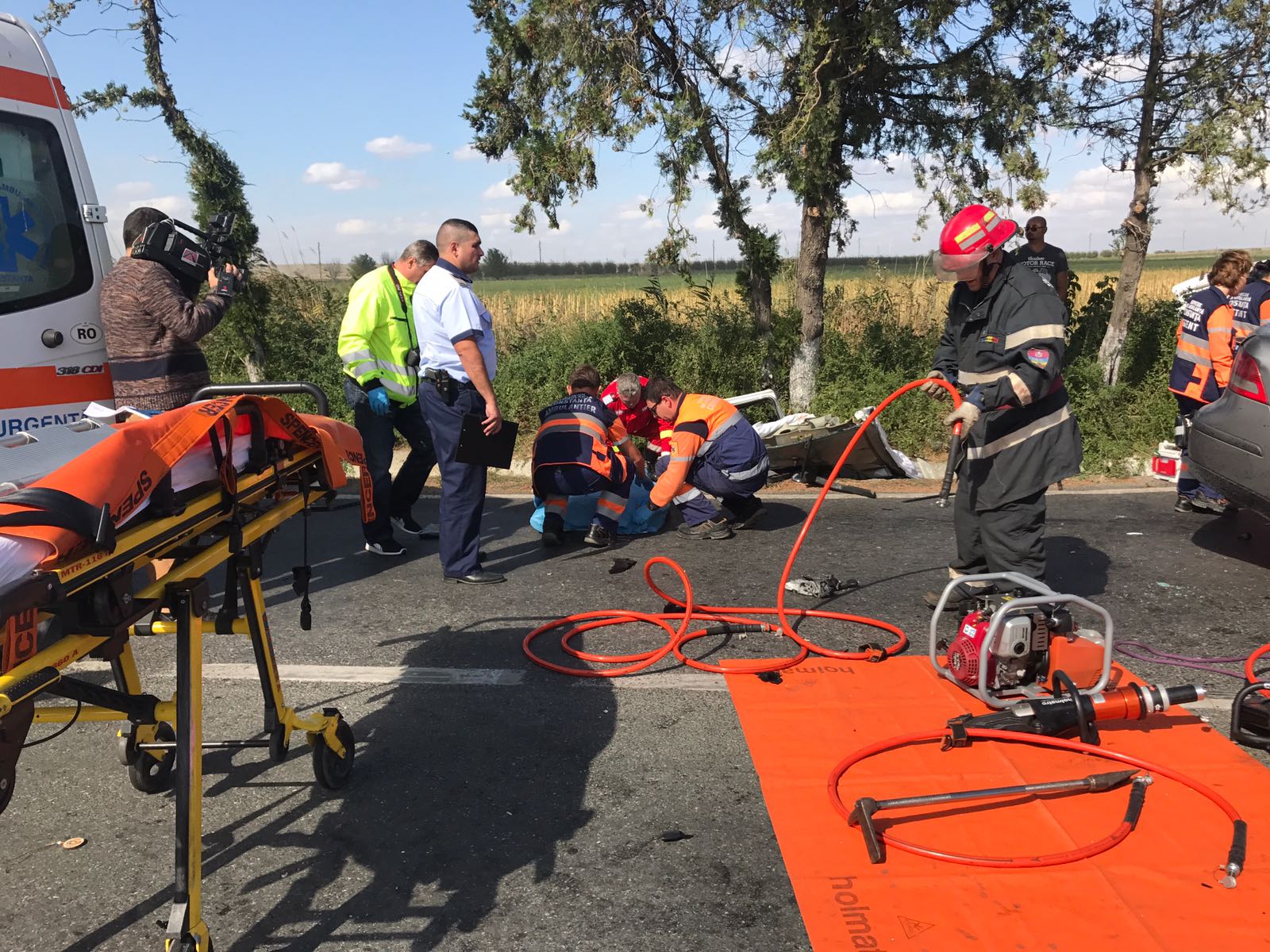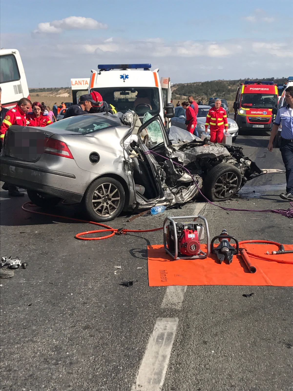 La fața locului intervin echipaje de la descarcerare, șase ambulanțe, dar și elicopterul SMURD.