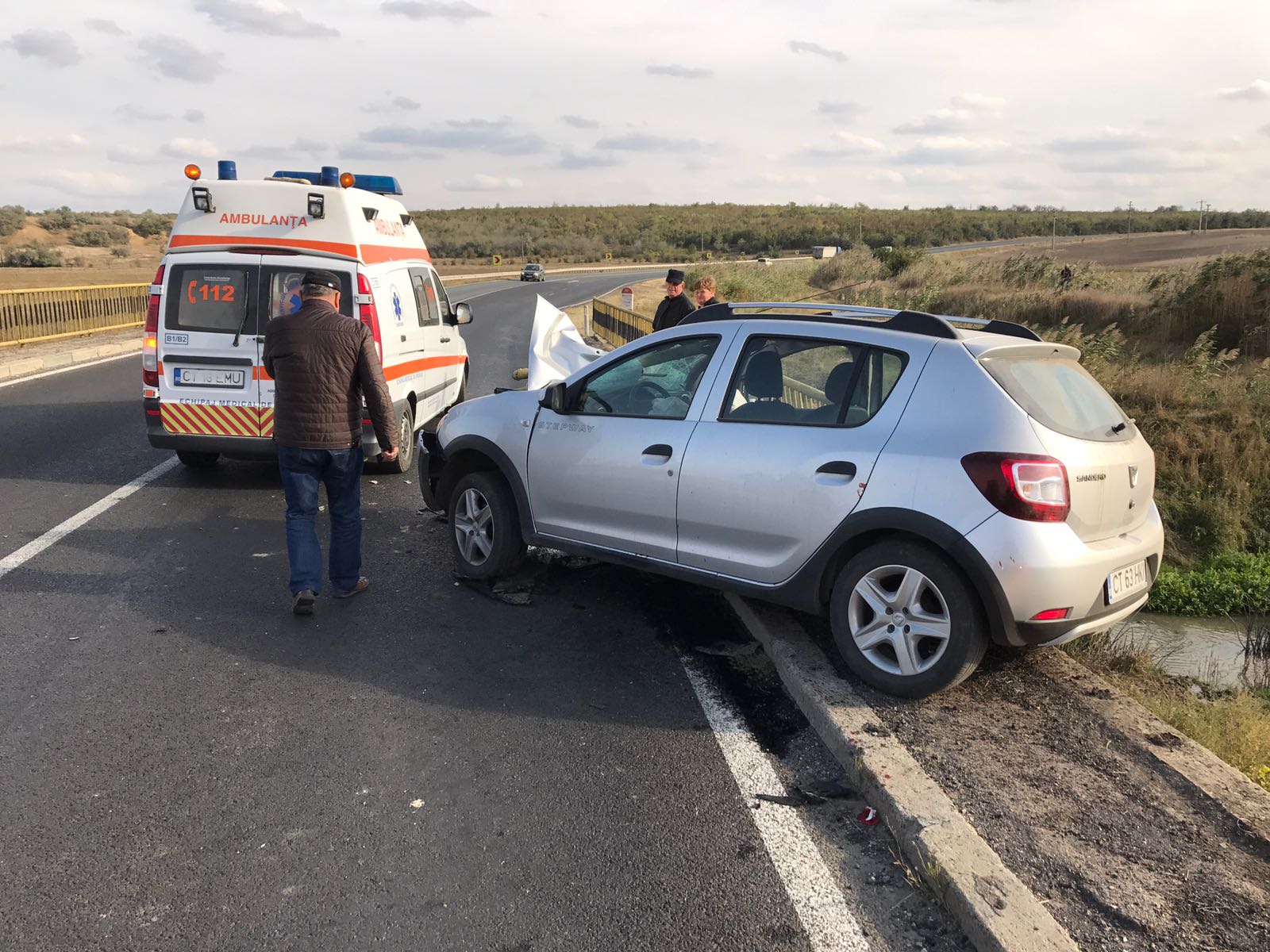 Șoferul spune că i-ar fi sărit în cale un câine, pe care a vrut să-l evite, a tras de volan, însă gestul era cât pe ce să le aducă moartea lui și pasagerului aflat pe locul din dreapta. Mașina s-a izbit puternic de parapetul podului, cât pe ce să se prăbușească în gol.