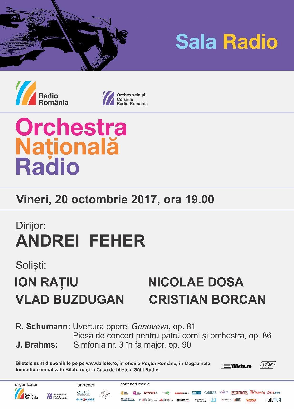 Vineri, 20 octombrie, de la ora 19:00, Orchestra Naţională Radio prezintă la Sala Radio un concert Schumann & Brahms, sub bagheta tânărului dirijor de origine română Andrei Feher, un nume în plină afirmare pe scena muzicală internaţională, în prezent director muzical al Kitchener – Waterloo Symphony Orchestra din Canada.