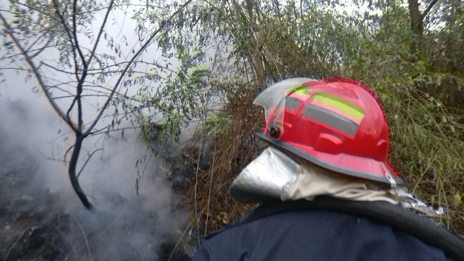 Incendiul se manifestă pe o suprafață de aproximativ 300 mp pe un teren viran se intervine cu o autospecială de stingere cu apă și spumă și 3 subofițeri.