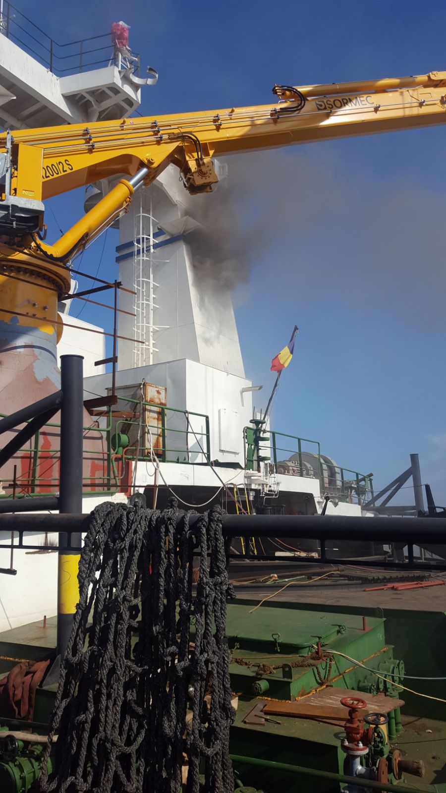 Pompierii militari au intervenit cu gaz inert pentru a-și croi drum către camera motoarelor, unde incendiul se manifestă cu violență. Cauzele izbucnirii flăcărilor sunt deocamdată incerte.
