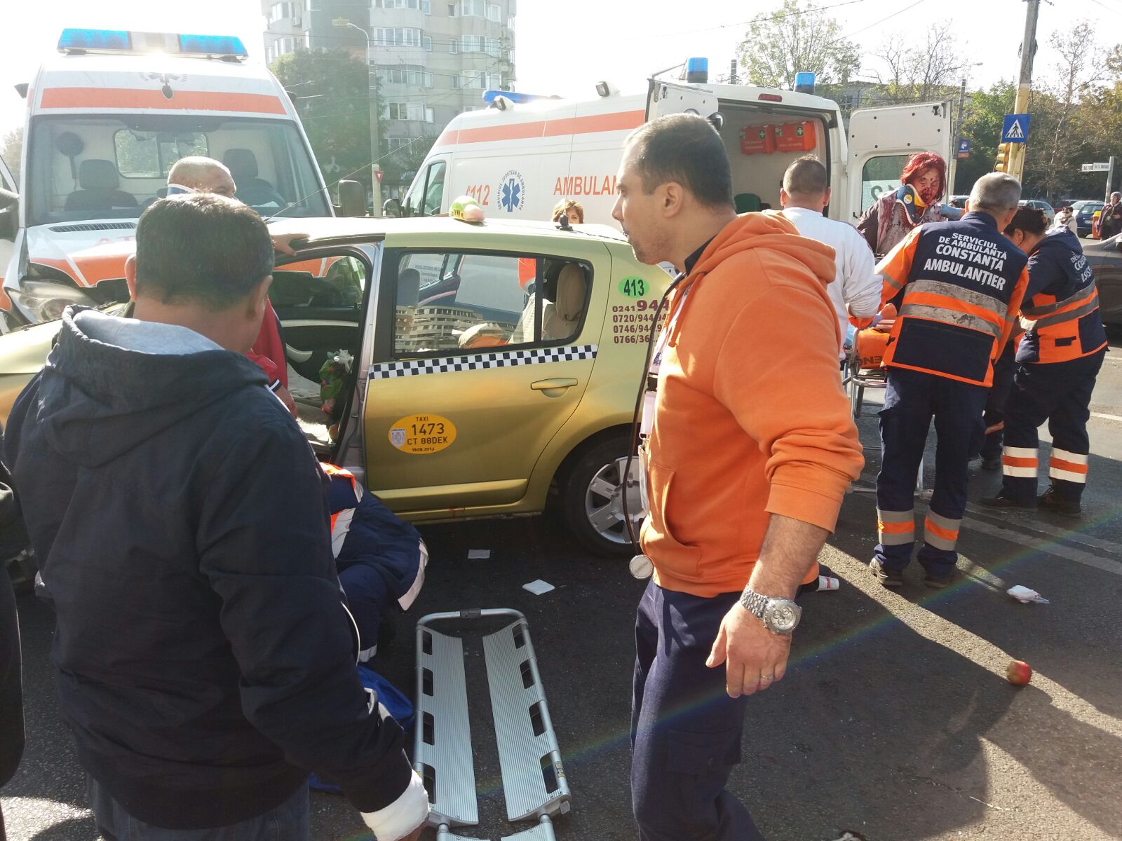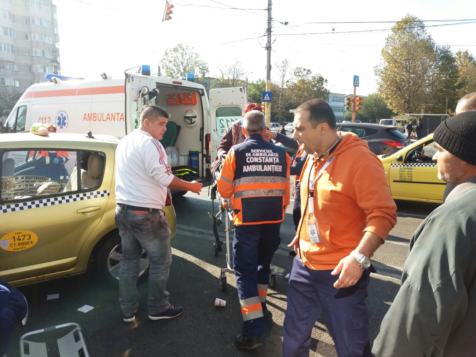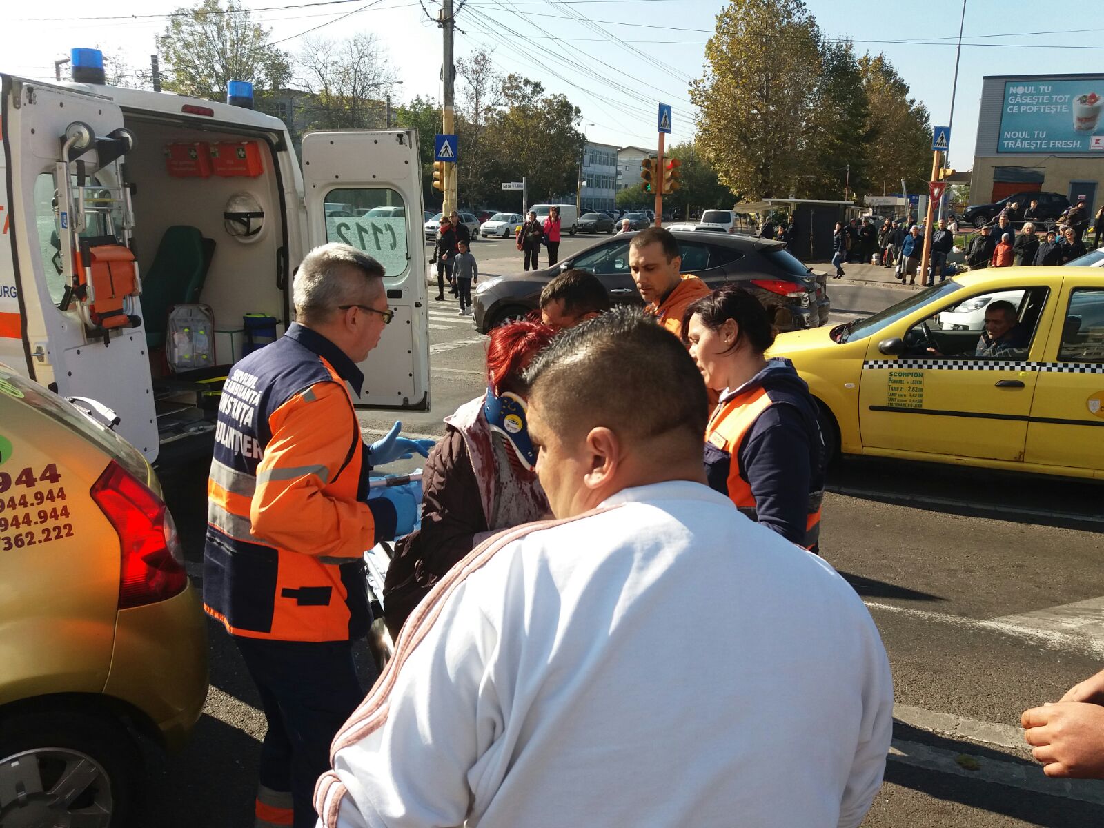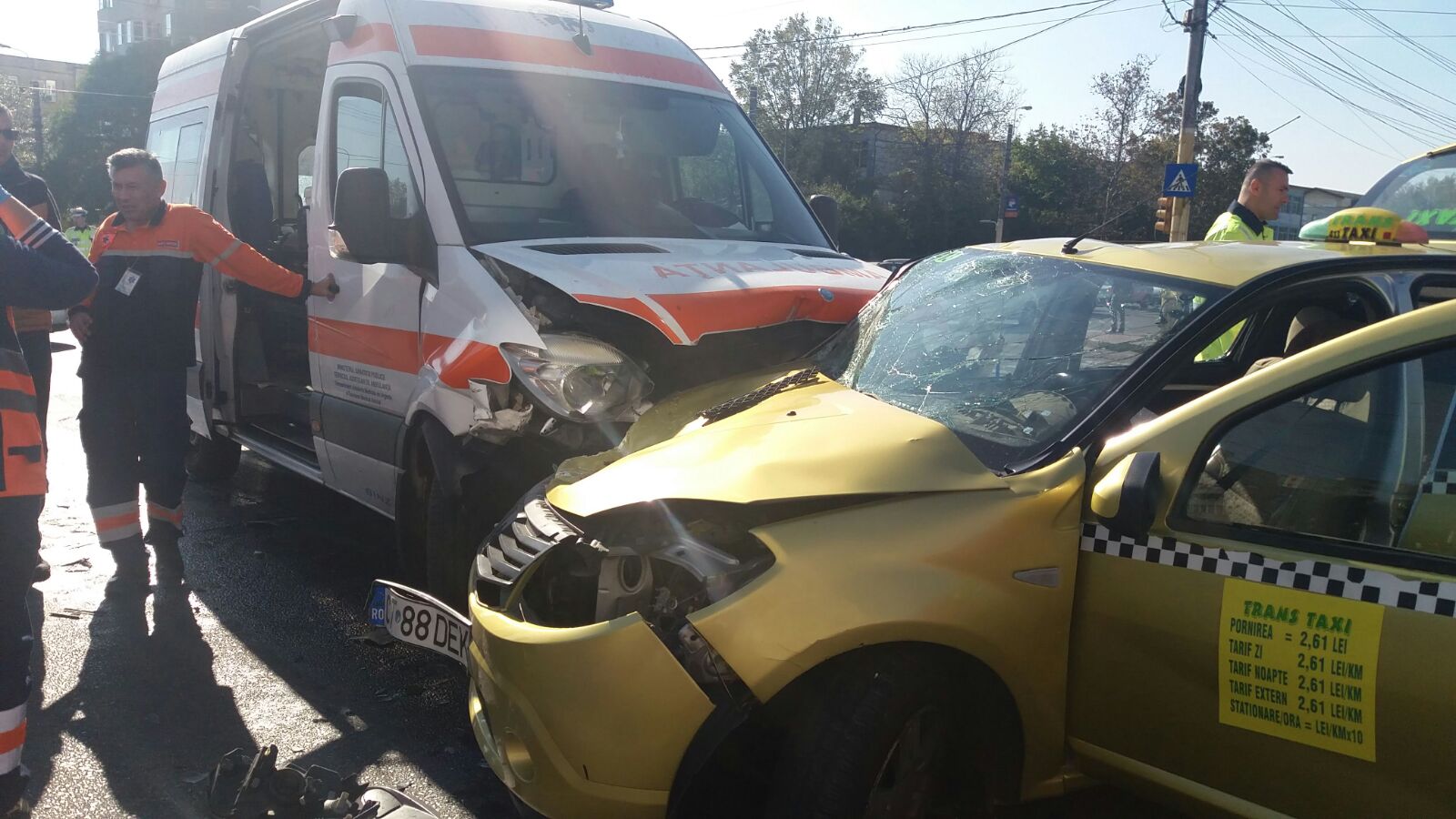 În urma impactului, șoferul taxiului și o pasageră au suferit răni la cap și la coloana cervicală. Ei au fost preluați de ambulanțele ajunse la fața locului și transportați la spital pentru îngrijiri medicale.