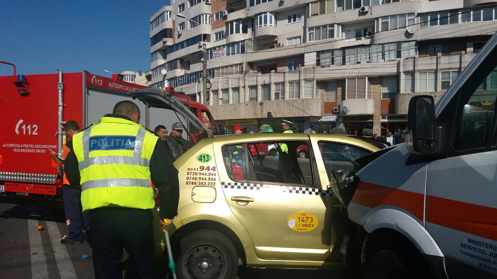 Din primele informații, este nevoie de intervenția echipajului de la descarcerare pentru a scoate victimele rămase captive în mașinile făcute praf. Unul dintre autoturismele implicate în impactul violent este un taxi.