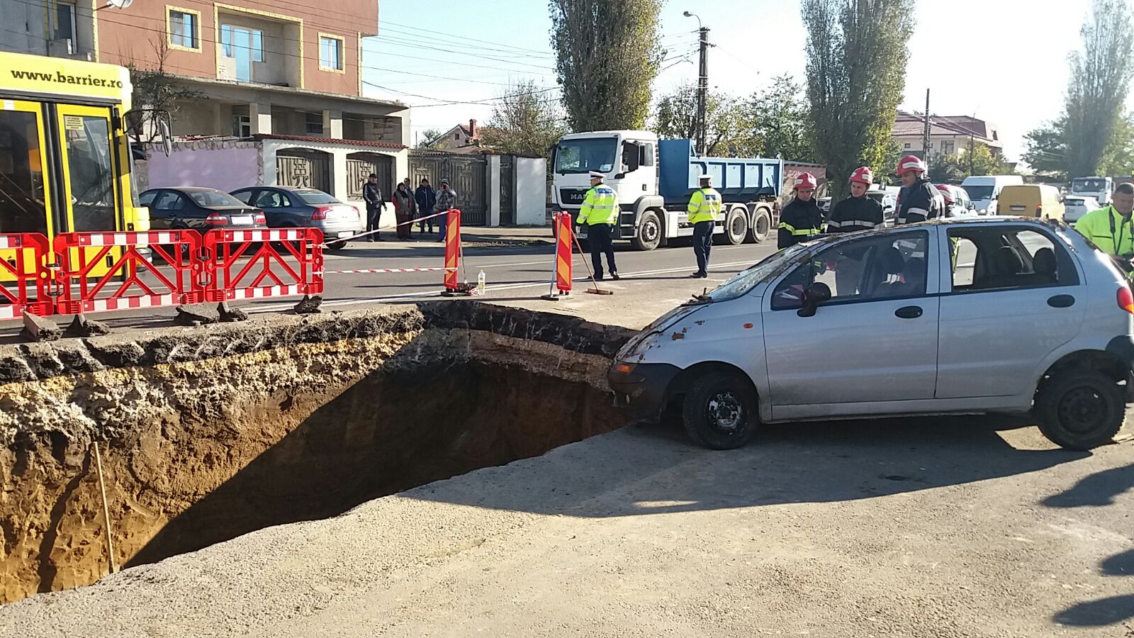 „A intrat printre semne cu mașina și ne-am pomenit cu el peste noi. Eram undeva mai în lateral. Totul s-a întâmplat într-o fracțiune de secundă. Pe colegul nostru l-a lovit la picioare. Vă dați seama, pe aici trec mașini, e zgomot, nu am auzit nimic deosebit, doar am văzut mașina care a plonjat“, spune unul dintre colegii muncitorului prins sub mașina care a căzut în groapă.