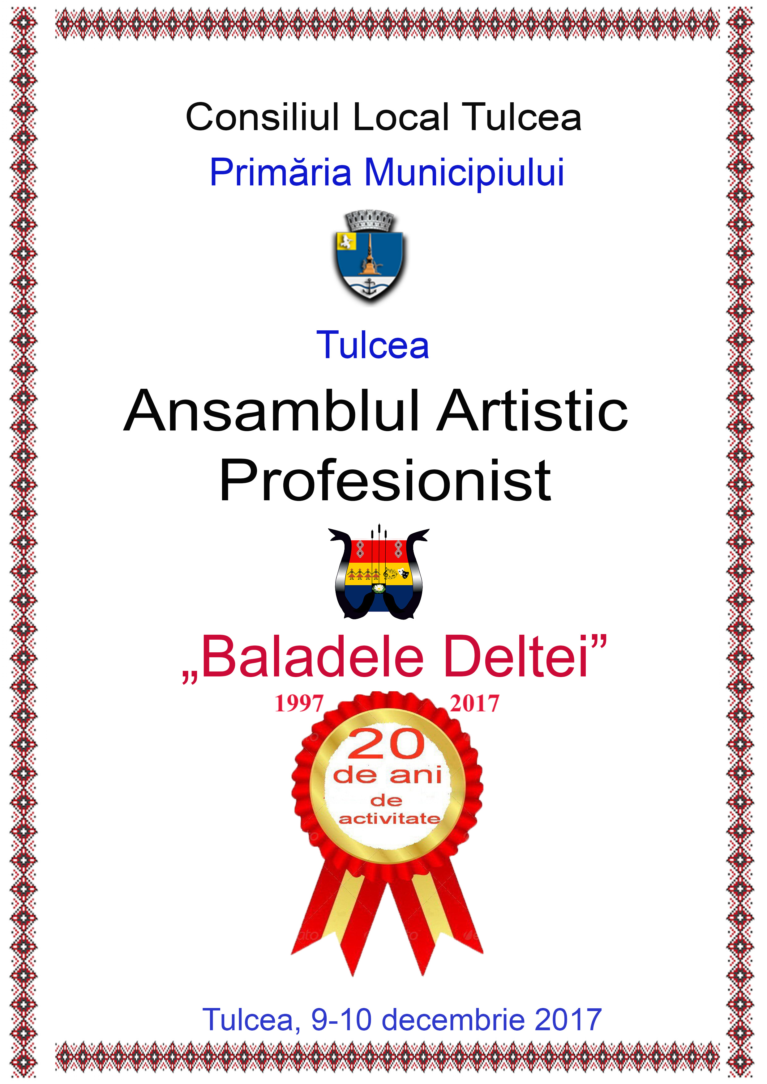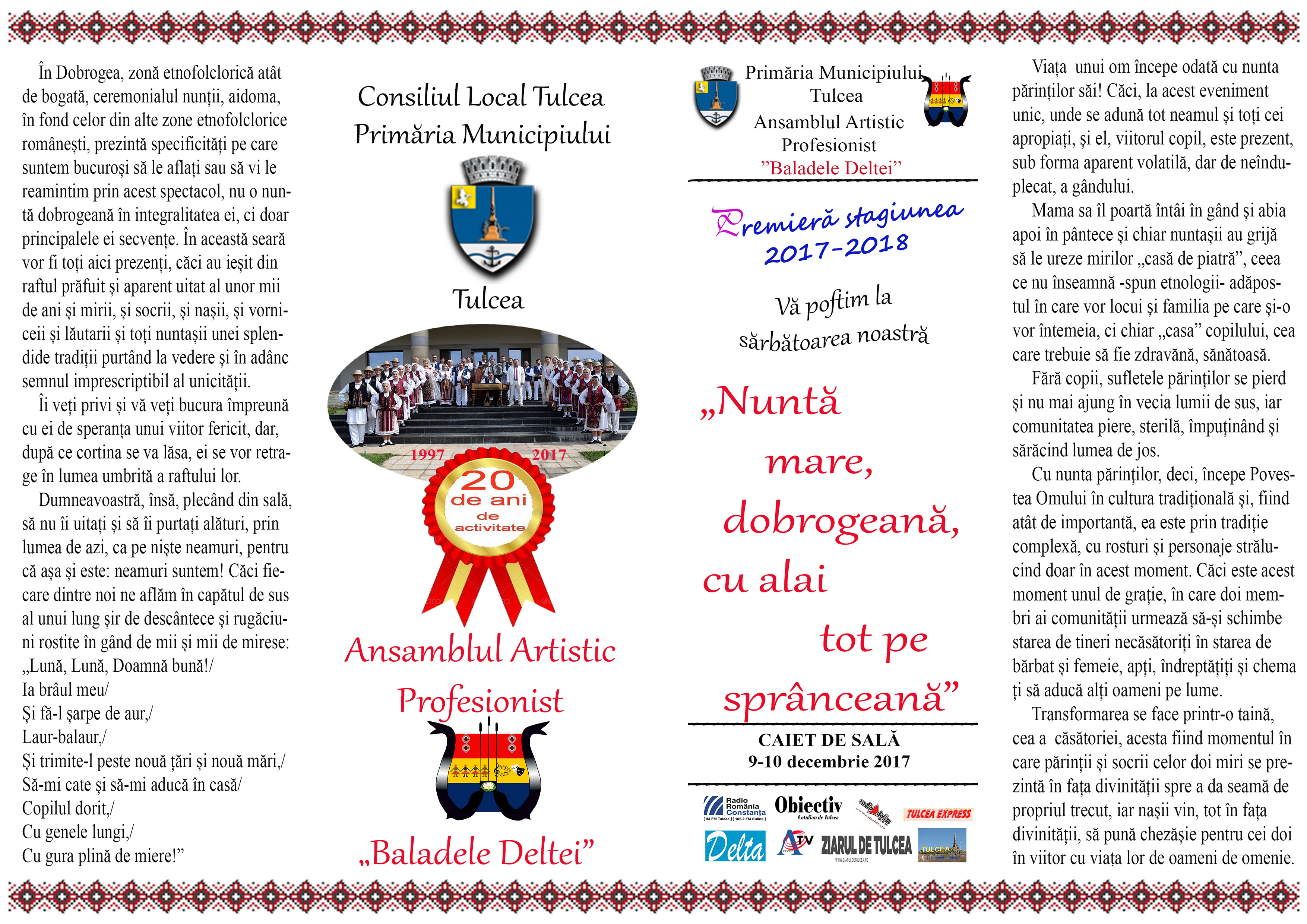 Ansamblul Artistic Profesionist „Baladele Deltei” împlinește în acest an, 20 de ani de existență! Cu acest prilej „Baladele Deltei” va prezenta – sâmbătă, 9 decembrie 2017, de la 17.30 și duminică, 10 decembrie 2017, de la ora 18.00 – la Teatrul „Jean Bart” din municipiu, spectacolul „Nuntă mare, dobrogeană, cu alai tot pe sprânceană”.