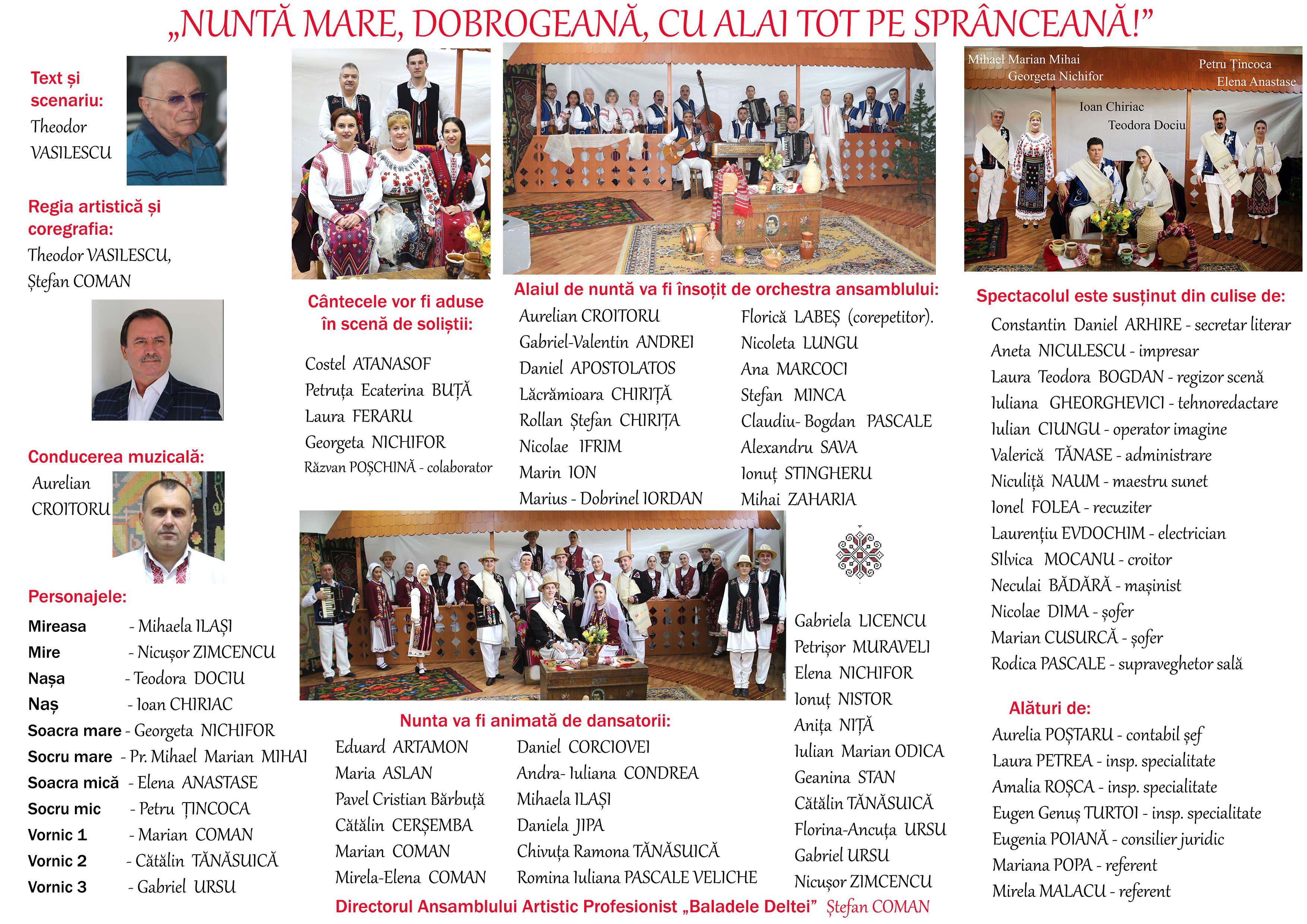 În Dobrogea, zonă etnofolclorică atât de bogată, ceremonialul nunții, aidoma în fond celor din alte zone etnofolclorice românești, prezintă specificități pe care spectatorii le vor afla sau și le vor reaminti  prin acest spectacol; nu o nuntă dobrogeană în integralitatea ei, ci doar principalele ei secvențe. La spectacol vor fi toți prezenți, ieșiți din raftul prăfuit și aparent uitat al unor mii de ani și mirii, și socrii, și nașii, și vorniceii și lăutarii și toți nuntașii unei splendide tradiții  purtând la vedere și în adânc semnul imprescriptibil al unicității. Spectatorii îi vor putea privi și poate se vor bucura împreună cu ei de speranța unui viitor fericit, anunță printr-un comunicat de presă directorul Ansamblului Artistic Profesionist „Baladele Deltei”, prof.Ștefan Coman.