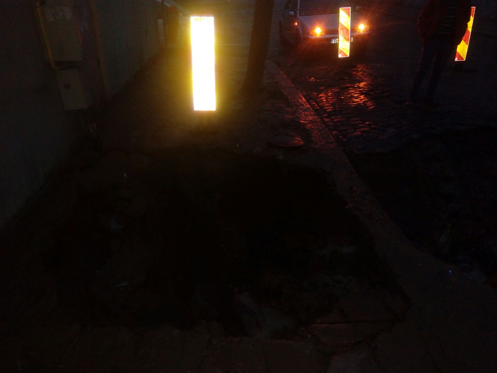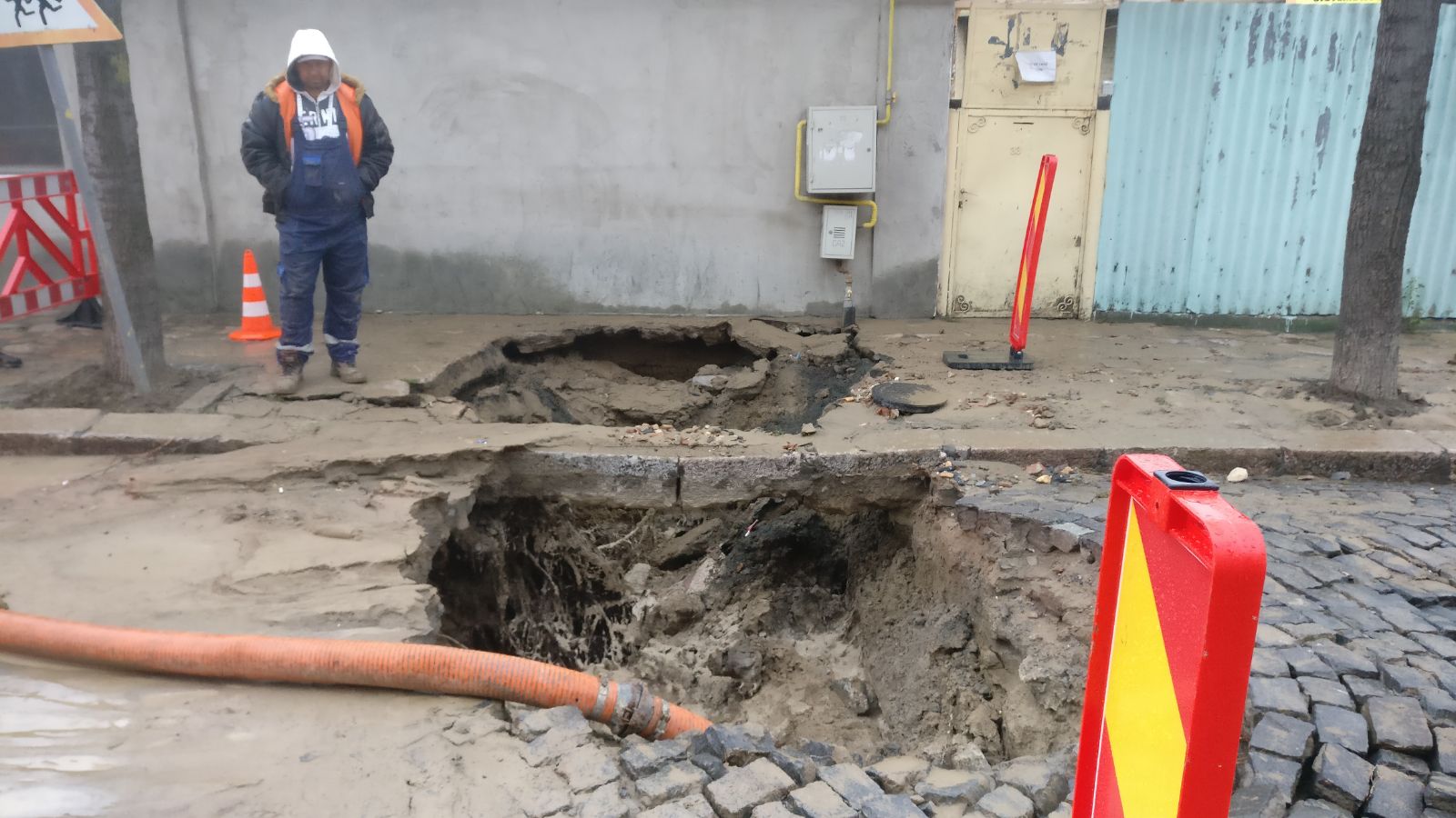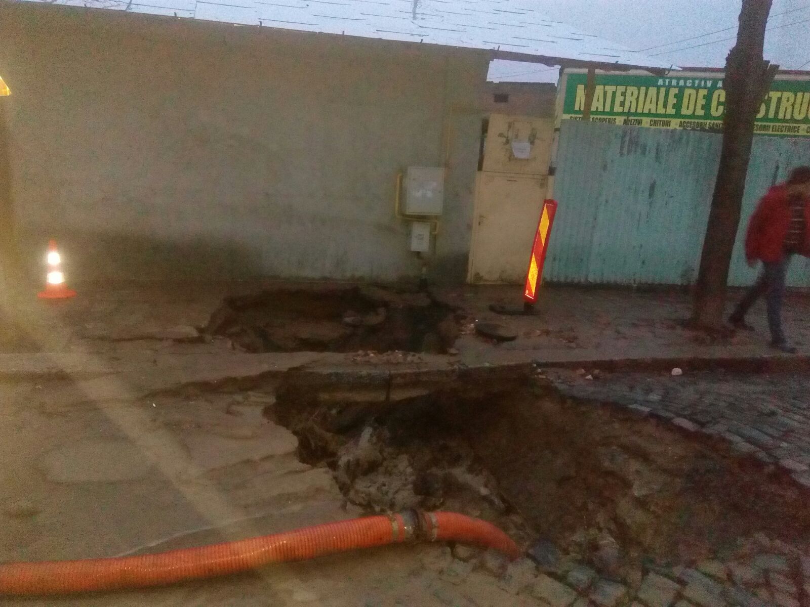 FOTO: O porțiune a unei străzi din TULCEA s-a surpat după ce o conductă de apă a cedat