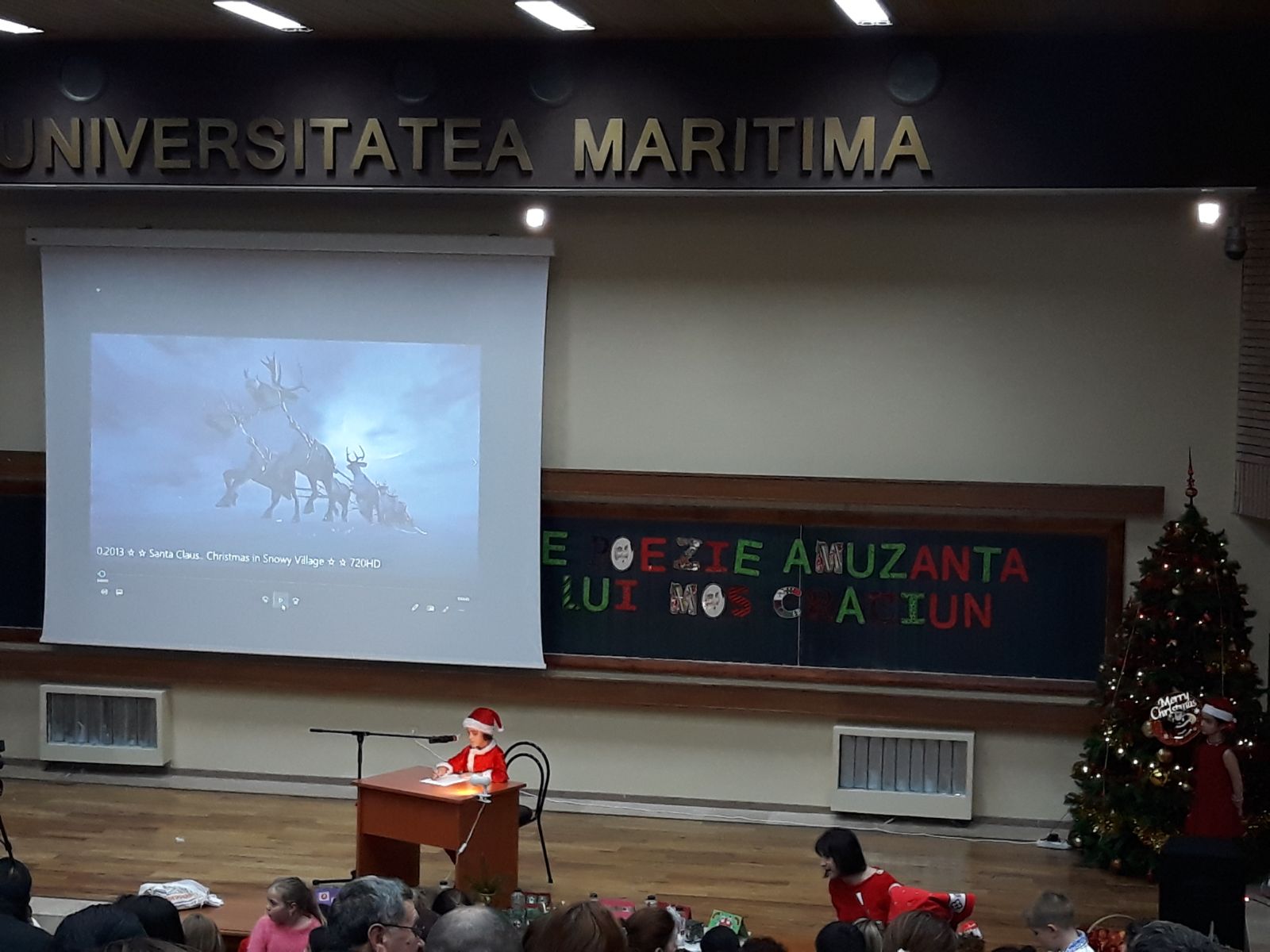 Peste 180 de copii din clasele primare l-au întâmpinat pe Moş Crăciun, în Aula Universităţii Maritime Constanţa.