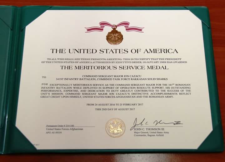 Constănțeanul Ion Cristinel Cazacu, plutonier – adjutant principal, subofiter de comandă la Brigada 9 Mecanizată Mărășești, a fost singurul care a primit din partea Armatei Statelor Unite ale Americii „The Meritorious Service Medal”, una dintre cele mai importante distinctii militare americane.