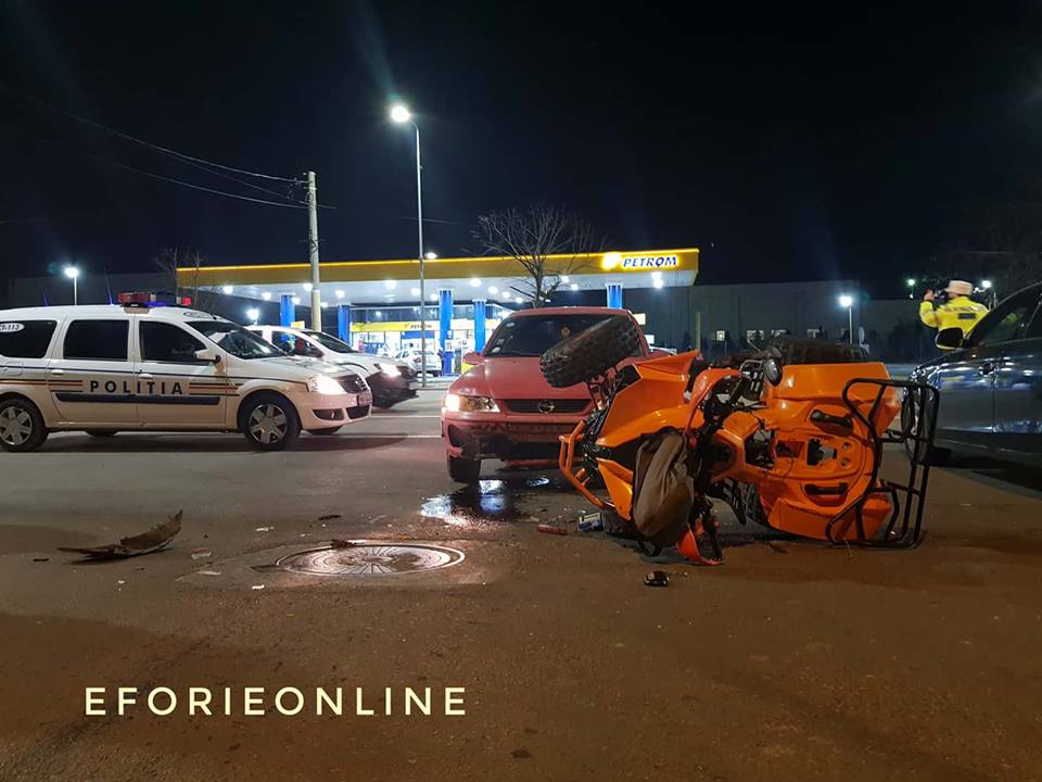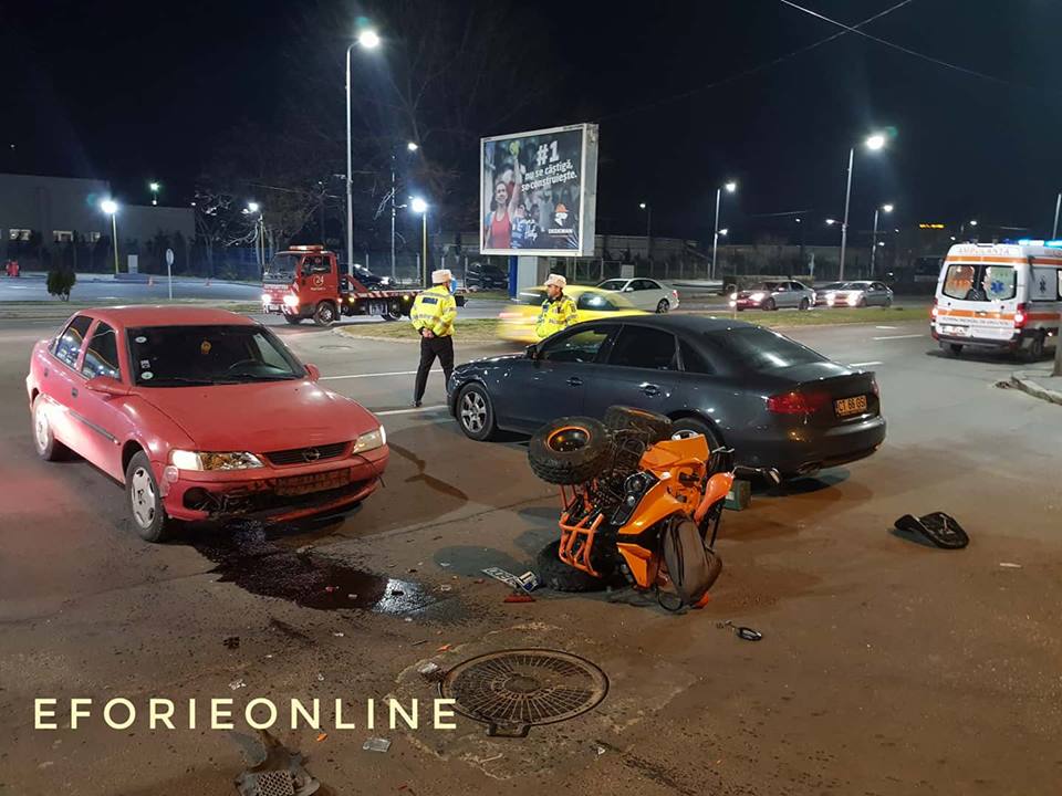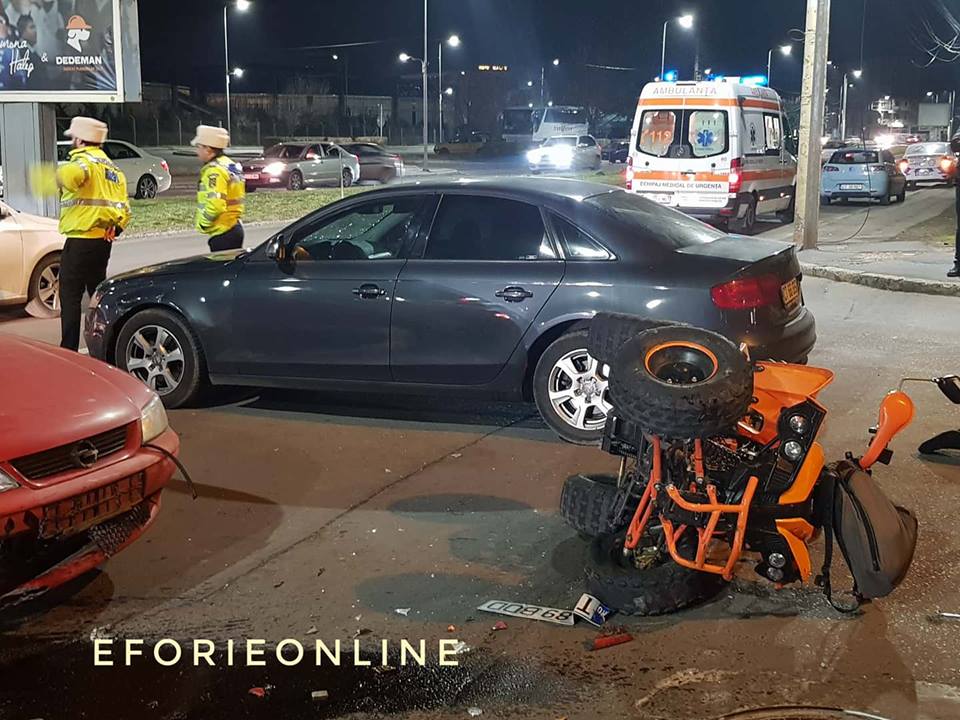 În impact au fost implicate două mașini și un ATV, iar în urma evenimentului rutier a rezultat o victimă. Este vorba despre un bărbat în vârstă de 56 de ani care prezintă un traumatism cranio-cerebral, unul toracic și încă un traumatism la unul din membrele inferioare.