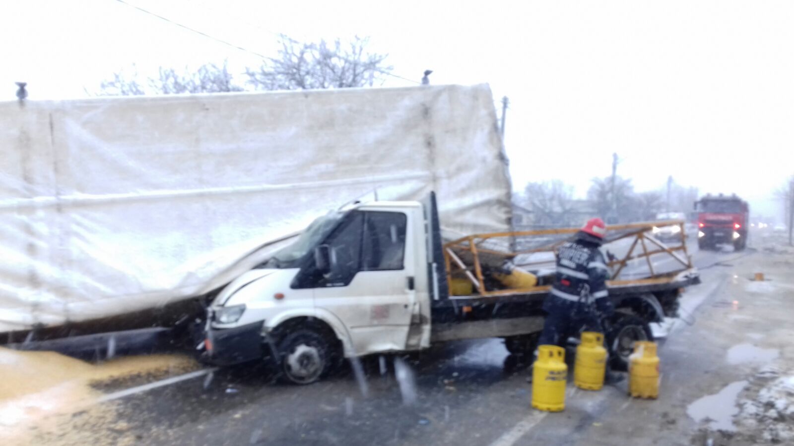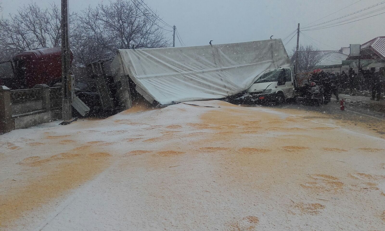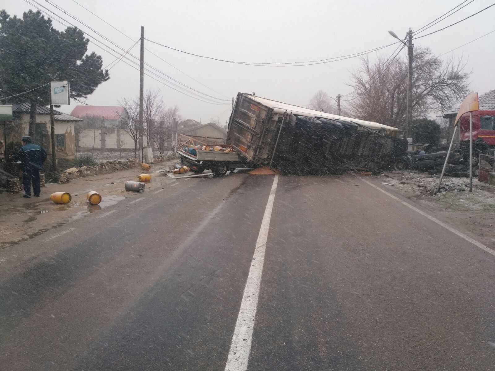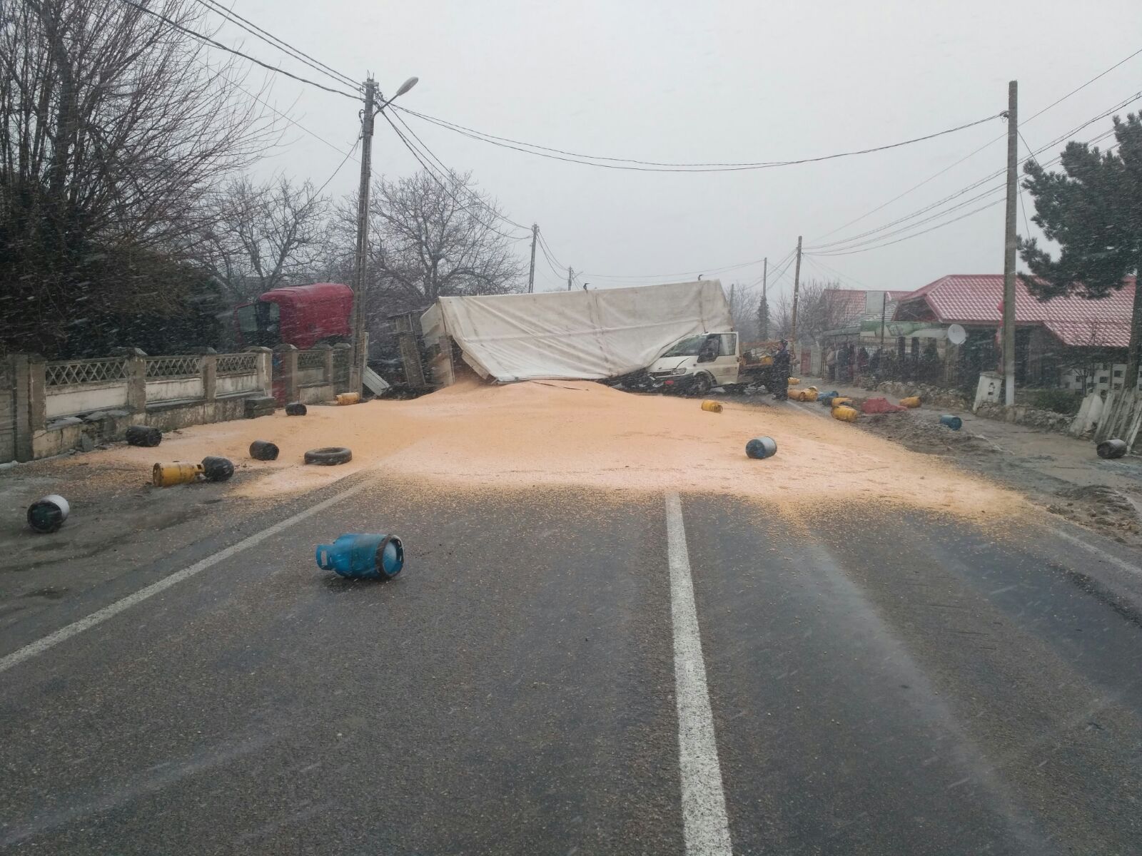 Un accident rutier a avut loc, joi după-amiaza, pe DN2A la intrare în localitatea Crucea. Potrivit priemlor informații un TIR s-a răsturnat peste o autoutilitară plină cu butelii încărcate.