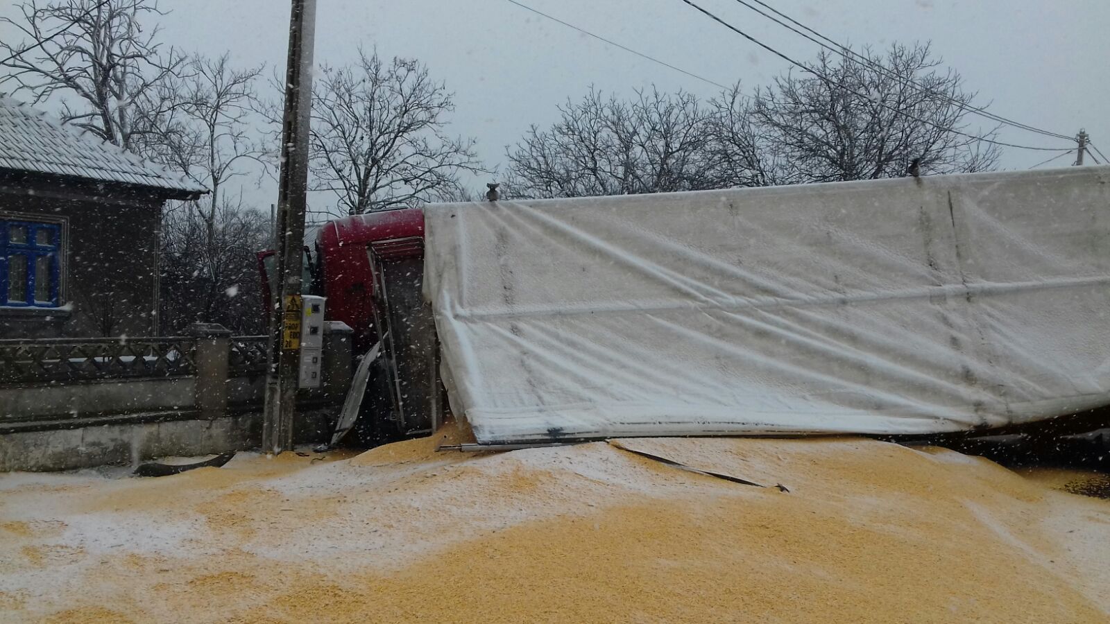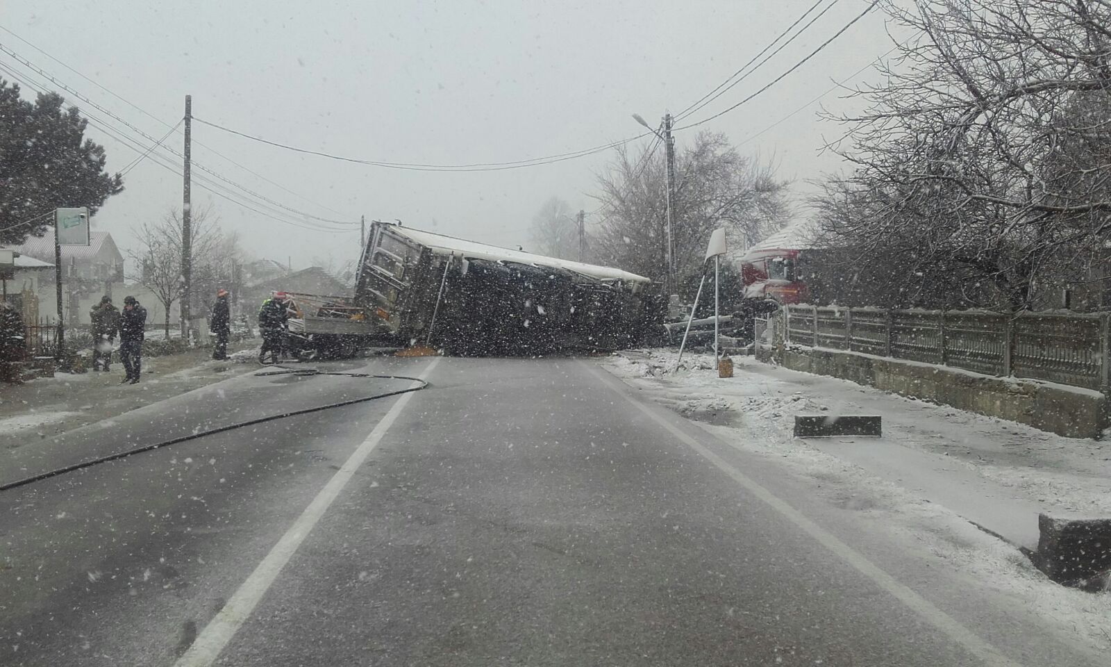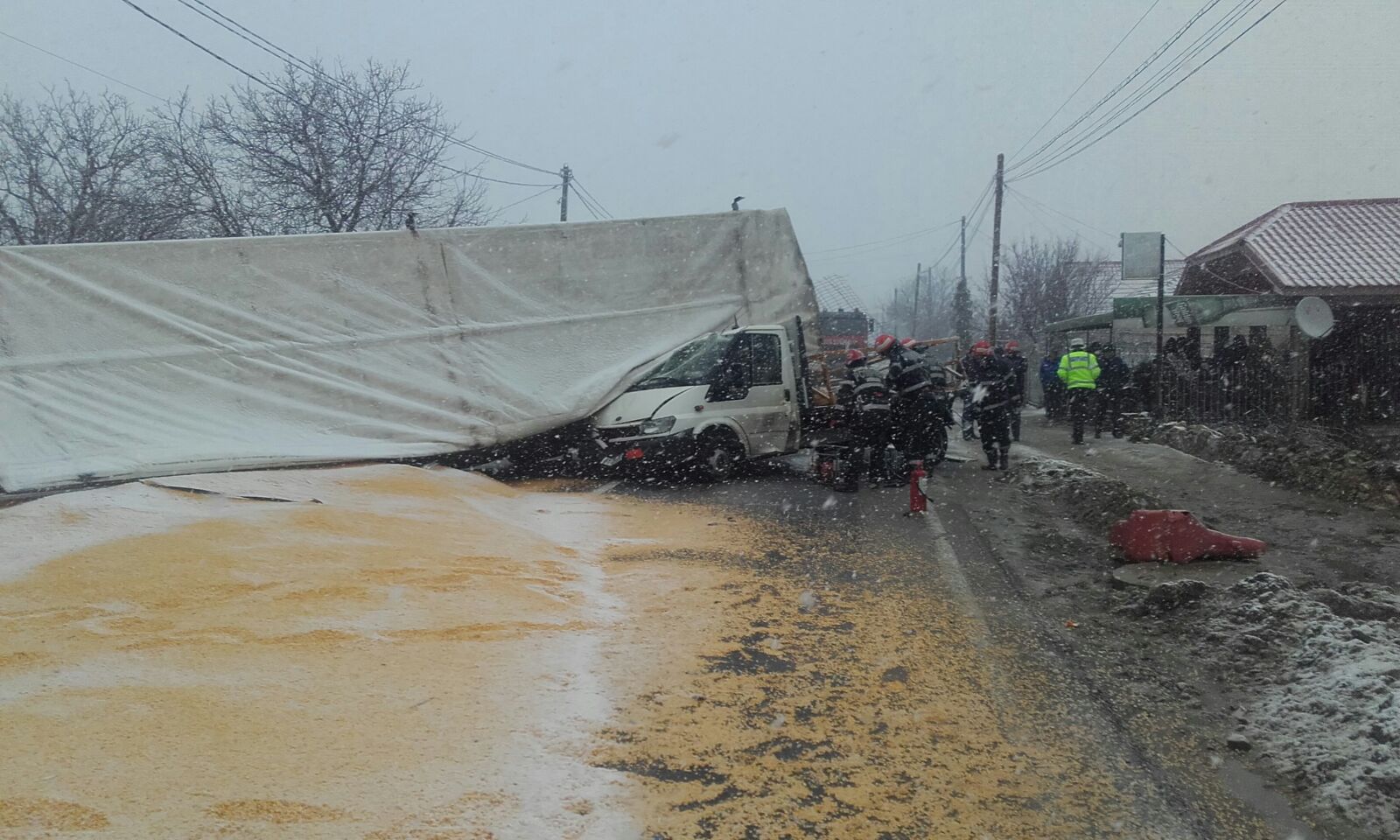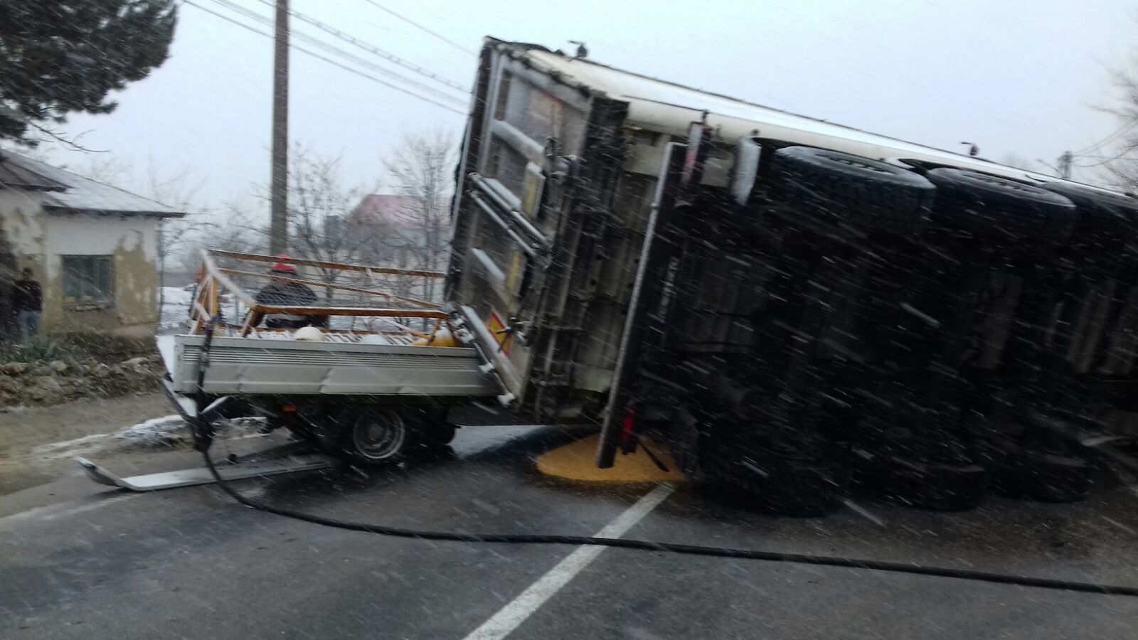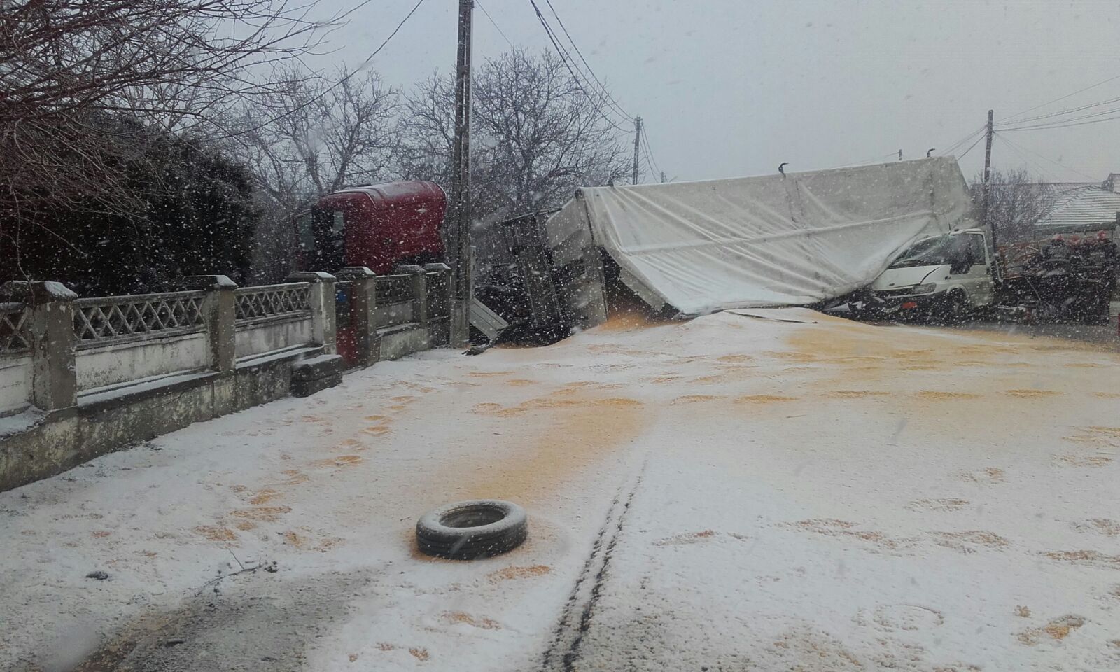 Un accident rutier a avut loc, joi după-amiaza, pe DN2A la intrare în localitatea Crucea. Potrivit priemlor informații un TIR s-a răsturnat peste o autoutilitară plină cu butelii încărcate.
