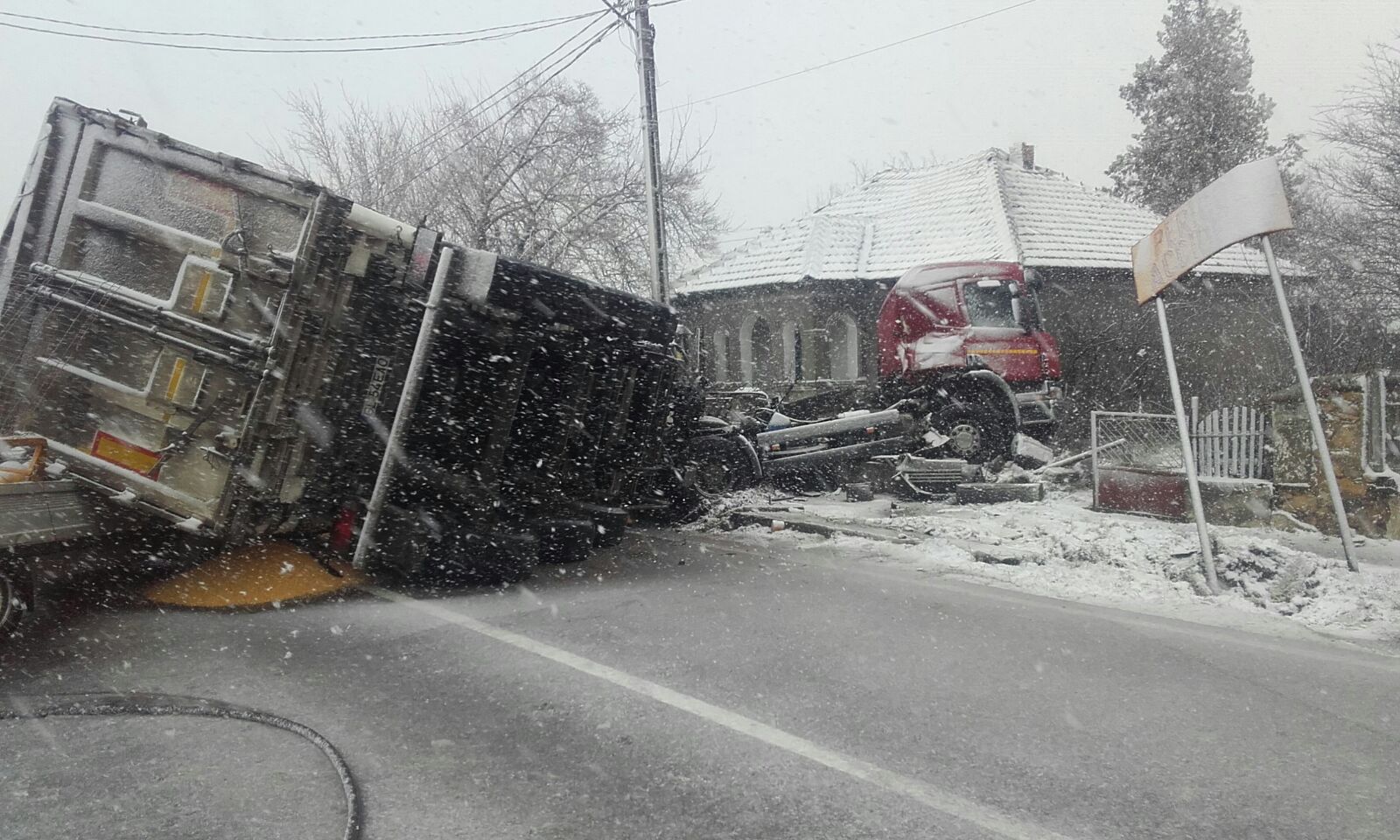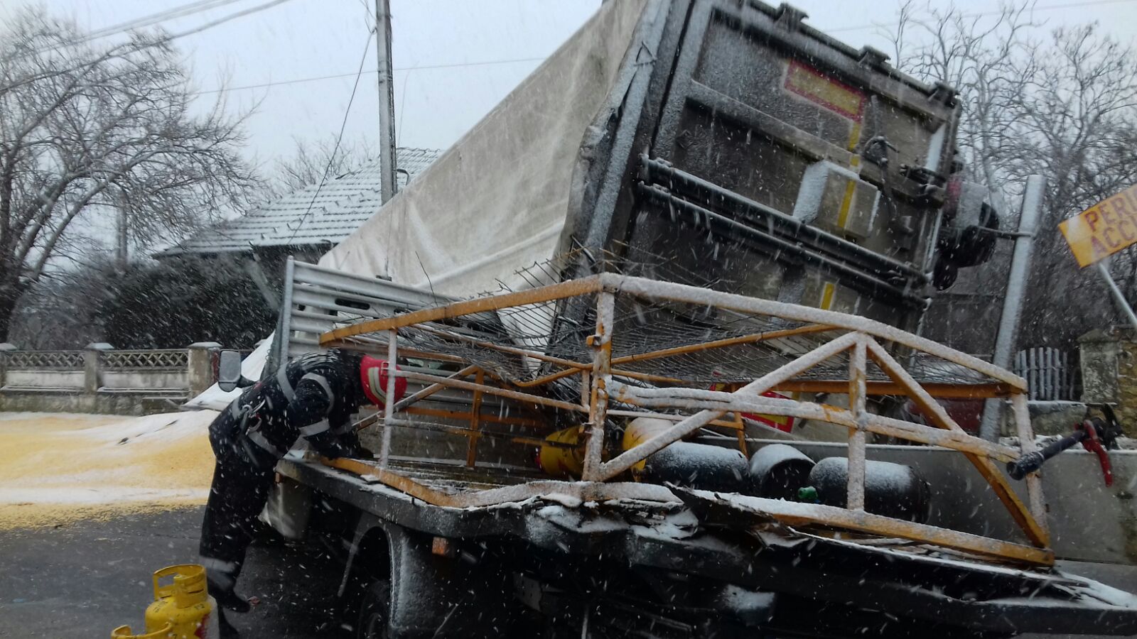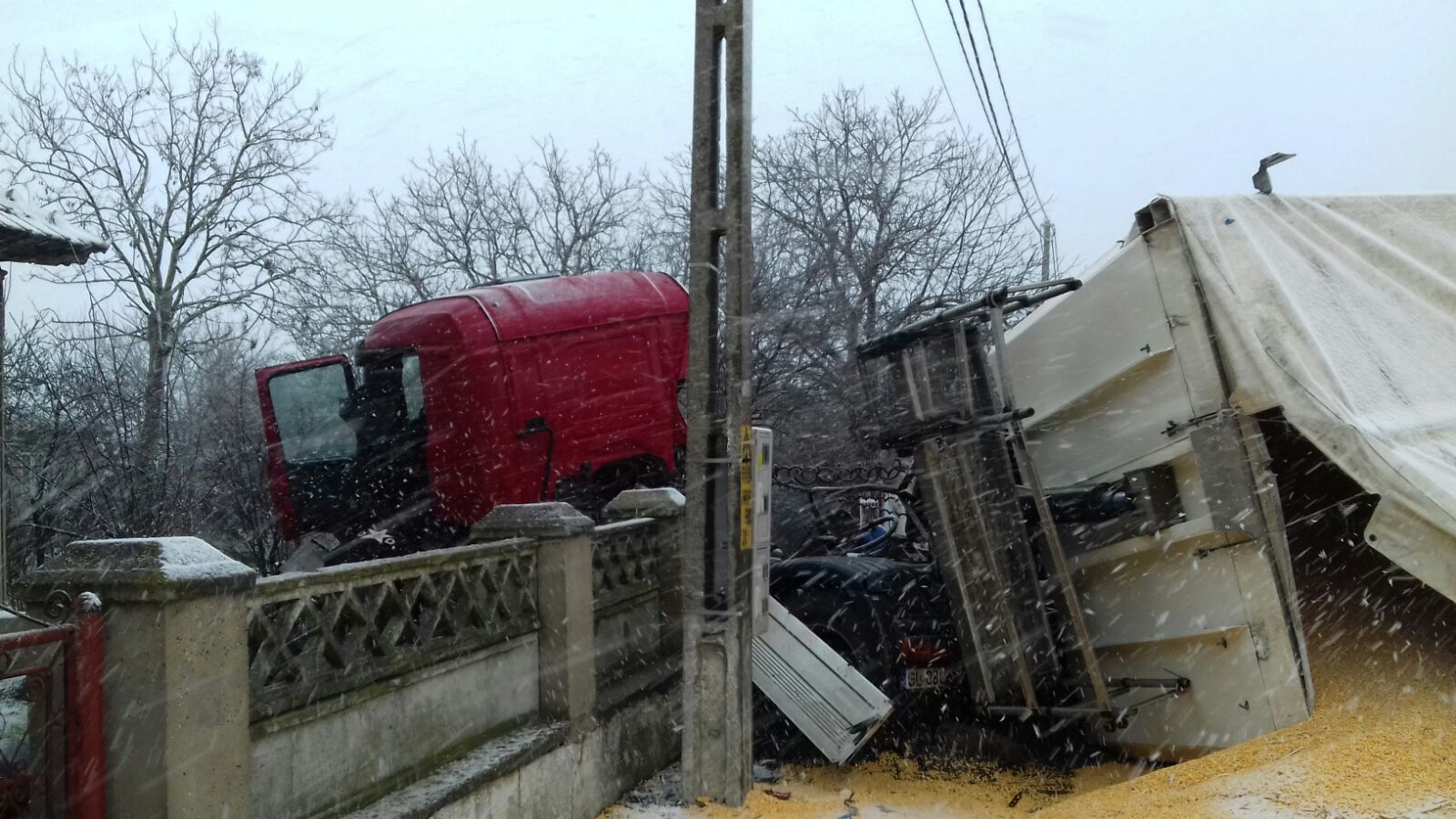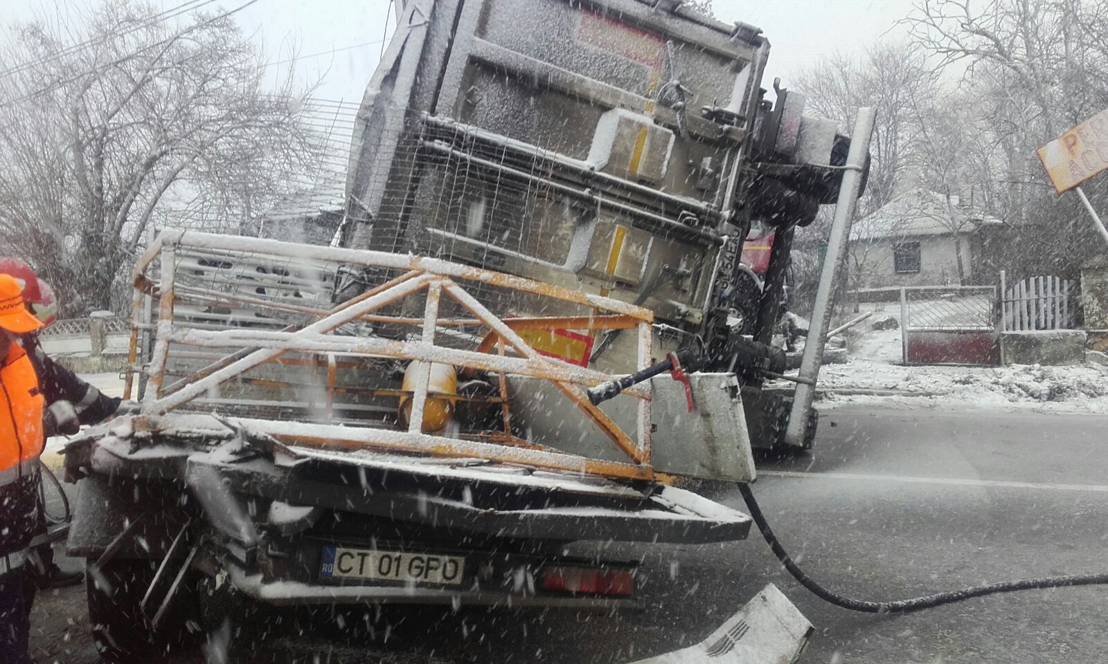 Un accident rutier a avut loc, joi după-amiaza, pe DN2A la intrare în localitatea Crucea. Potrivit priemlor informații un TIR s-a răsturnat peste o autoutilitară plină cu butelii încărcate.
