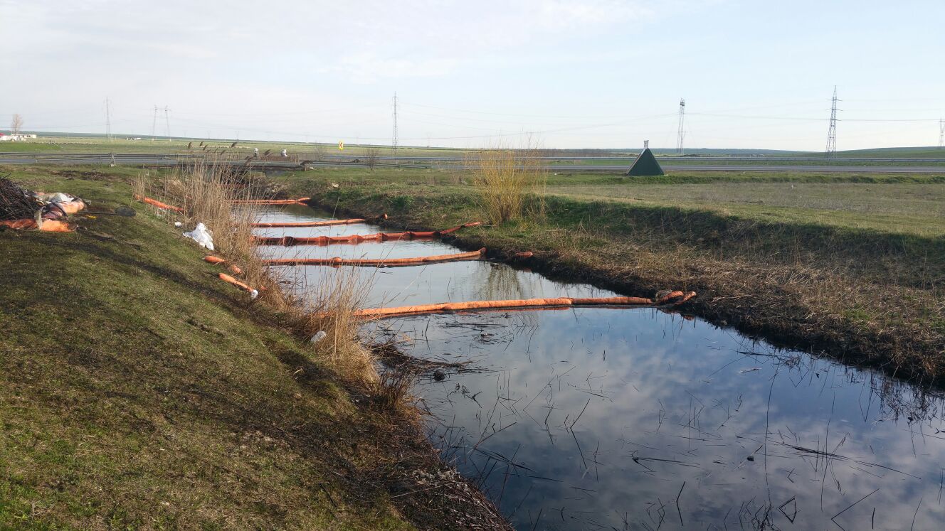 Pelicula de hidrocarburi nu s-a scurs în canal, pentru că a fost stopată cu baraje antipoluante de muncitorii unei firme de specialitate.