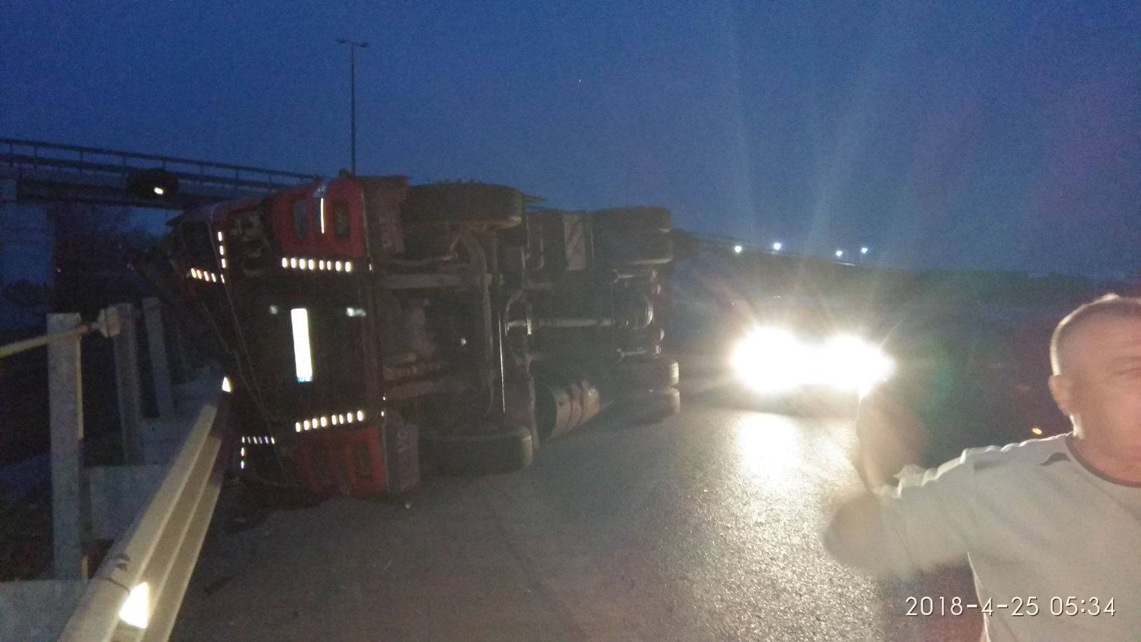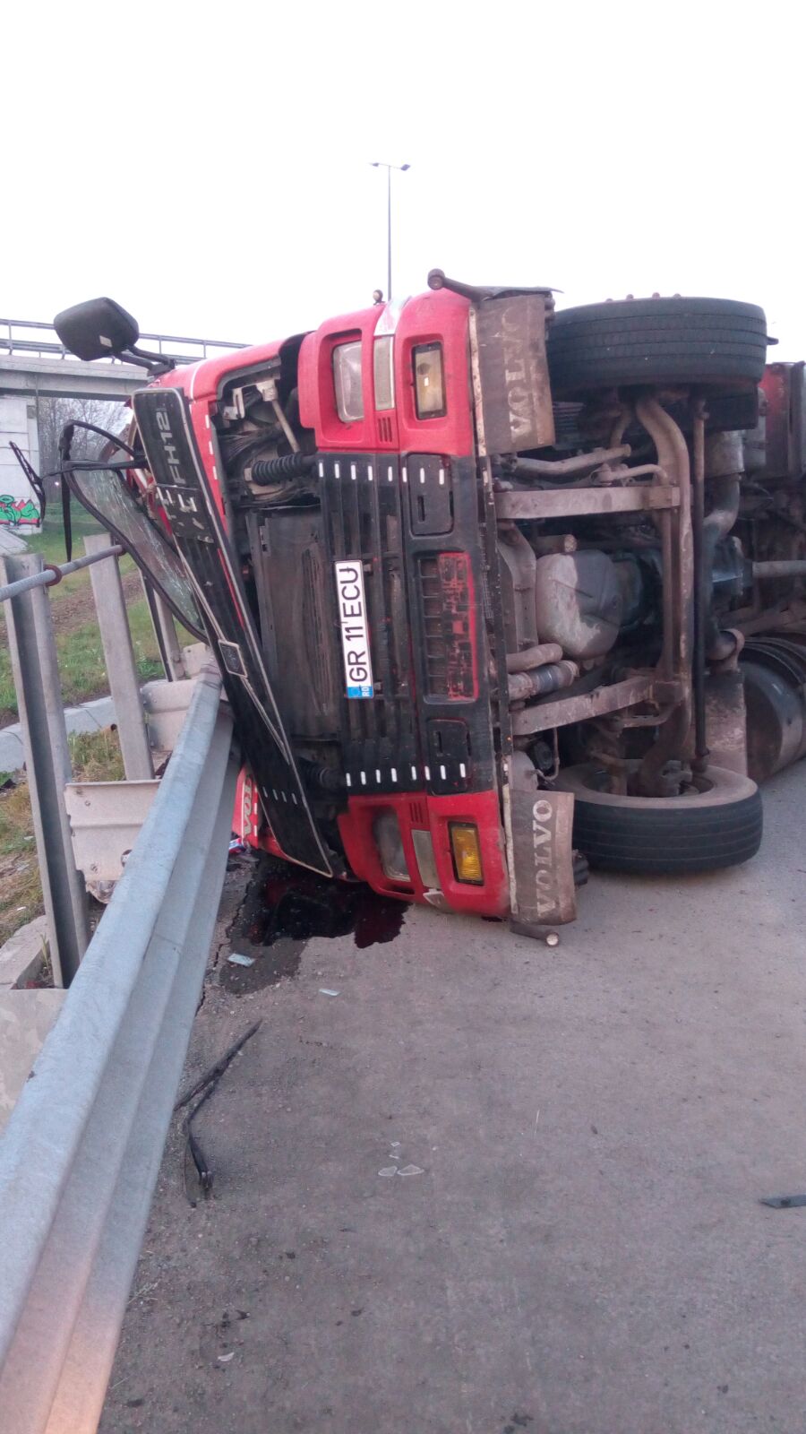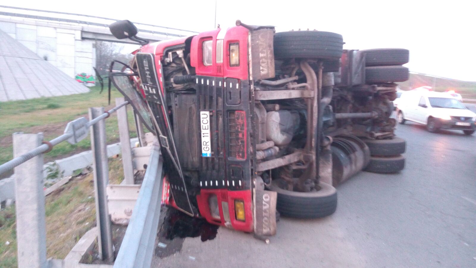 Ajungând la intersecția cu sens giratoriu A4 – DN39, nu a adaptat viteza necesară virajului, ocazie cu care s-a răsturnat pe partea dreapta in sensul giratoriu.