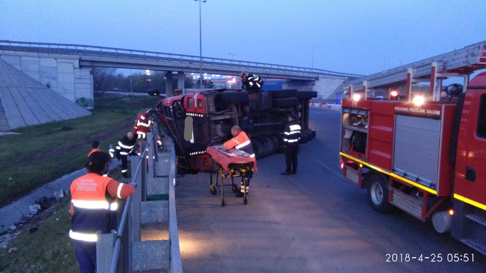 Potrivit primelor informații obținute de la ISU Dobrogea, o persoană a fost încarcerată în cabina unui camion care s-a răsturnat.