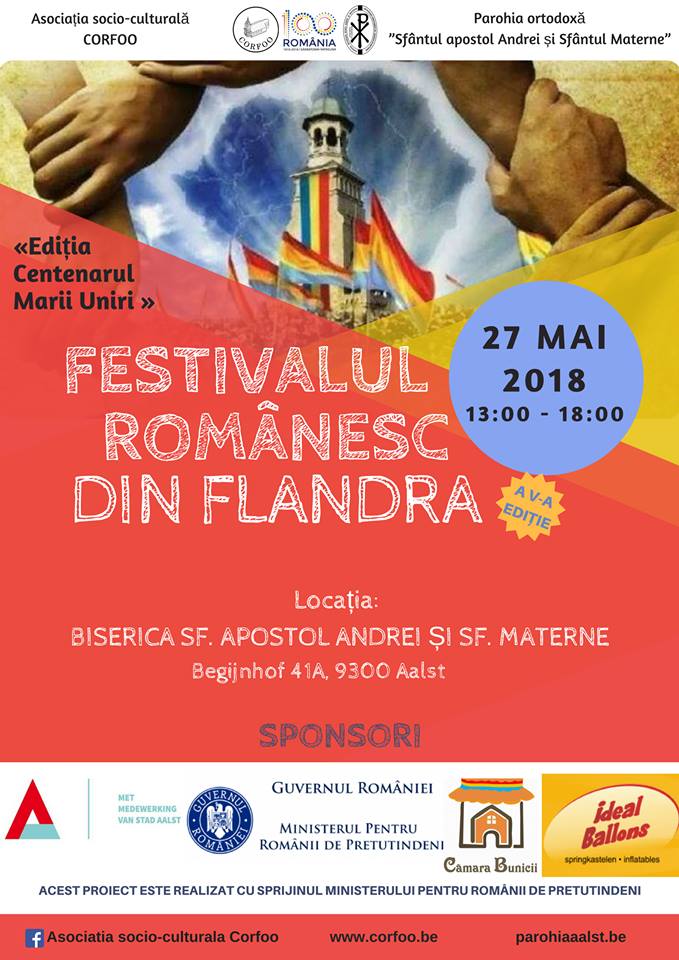 Ediția din acest an, cea de-a V- a, este consacrată „Centenarului Marii Uniri” și se va desfasura, duminică, 27 mai 2018, între orele 13.00 – 18.00, în orașul Aalst. Festivalul este organizat de Asociația Socio-Culturală Corfoo, în colaborare cu Parohia Ortodoxă Română Sfântul Apostol Andrei si Sfântul Ierarh Materne. Festivalul românesc din Flandra, este sustinut de „Ministerul românilor de pretutindeni” și Primăria orașului Aalst, din Belgia.