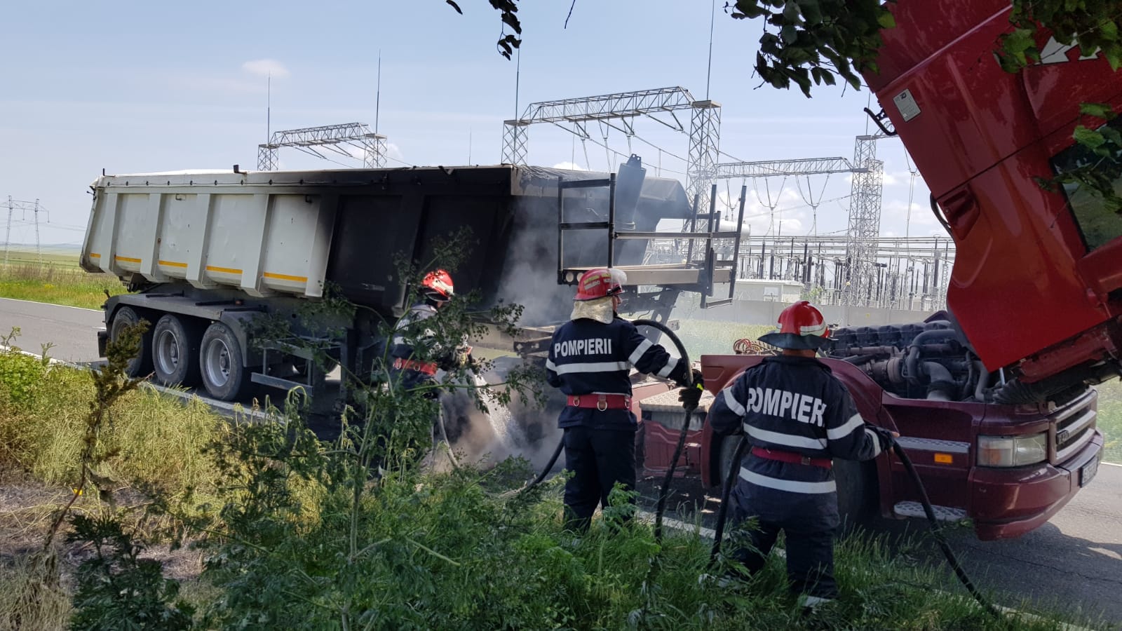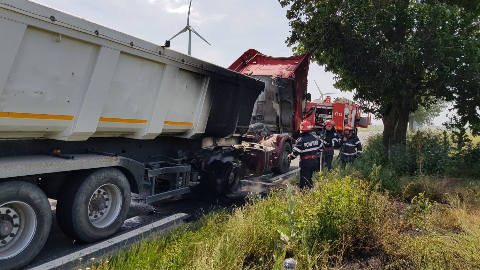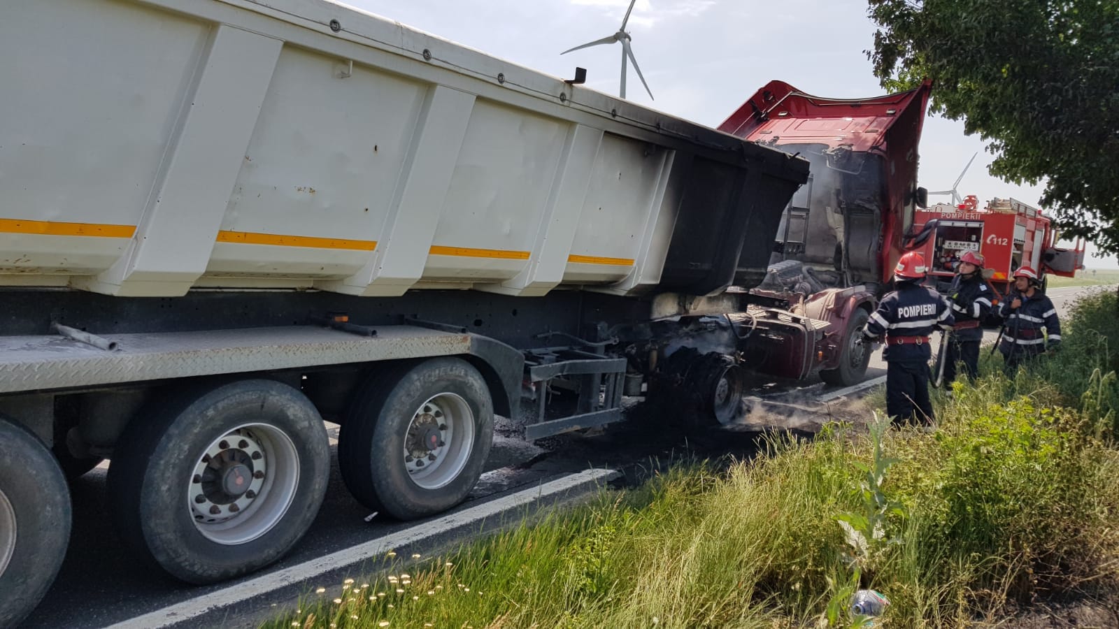 Pompierii din Babadag intervin pentru limitarea efectelor unui incendiu care se manifestă la remorca unui autotren. Incendiul a pornit de la o roată a remorcii. Autotrenul se afla în deplasare între Topolog și Saraiu pe DN22A.