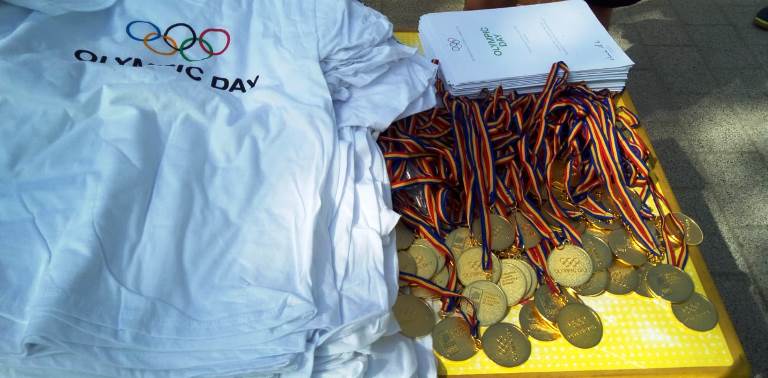 Organizatorii Crosului „Ziua Olimpică” au pregătit tricourile albe cu însemnele olimpice și medaliile pe care le vor oferi câștigătorilor precum și premiile speciale.