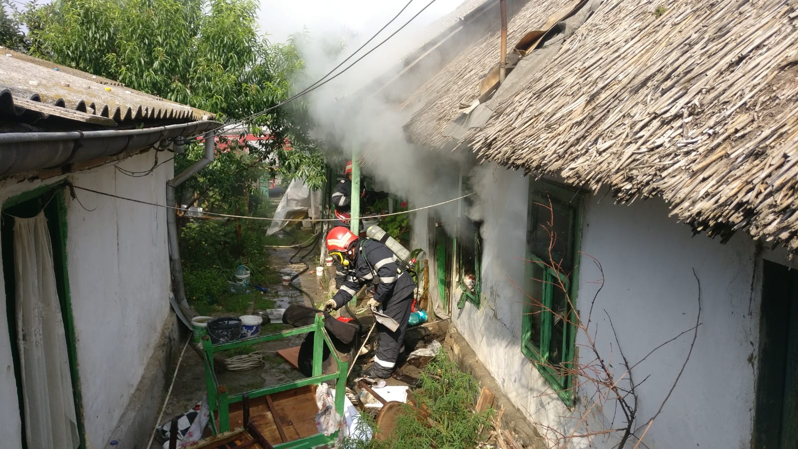 În casă se ala o femeie de 81 de ani, care primește îngrijiri de la medicii Serviciului de ambulanță (este conștientă și nu are arsuri).