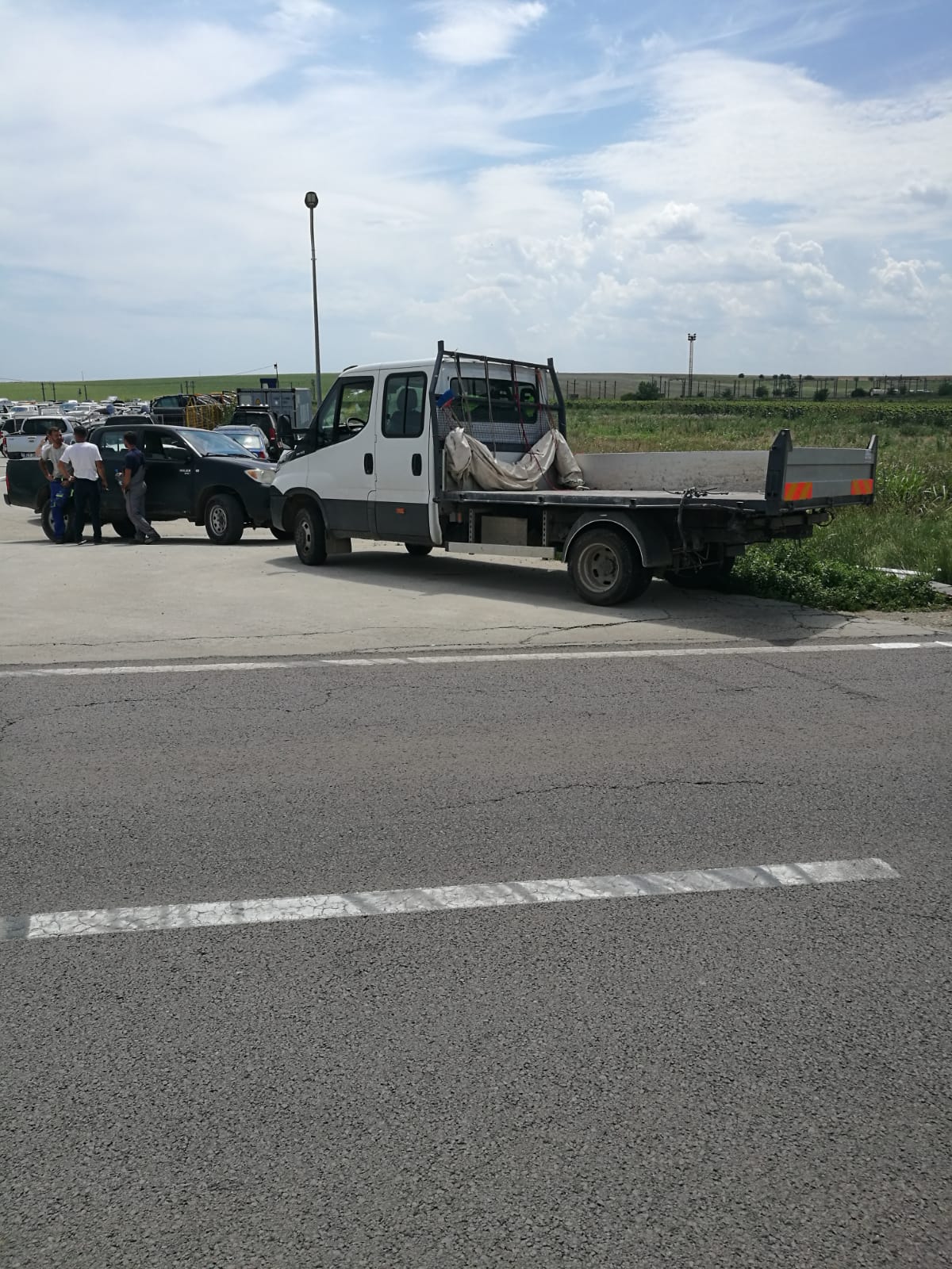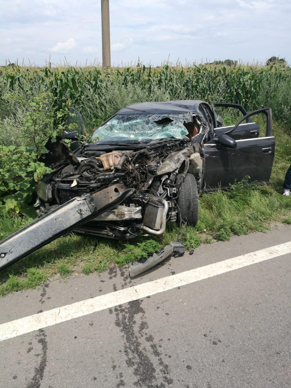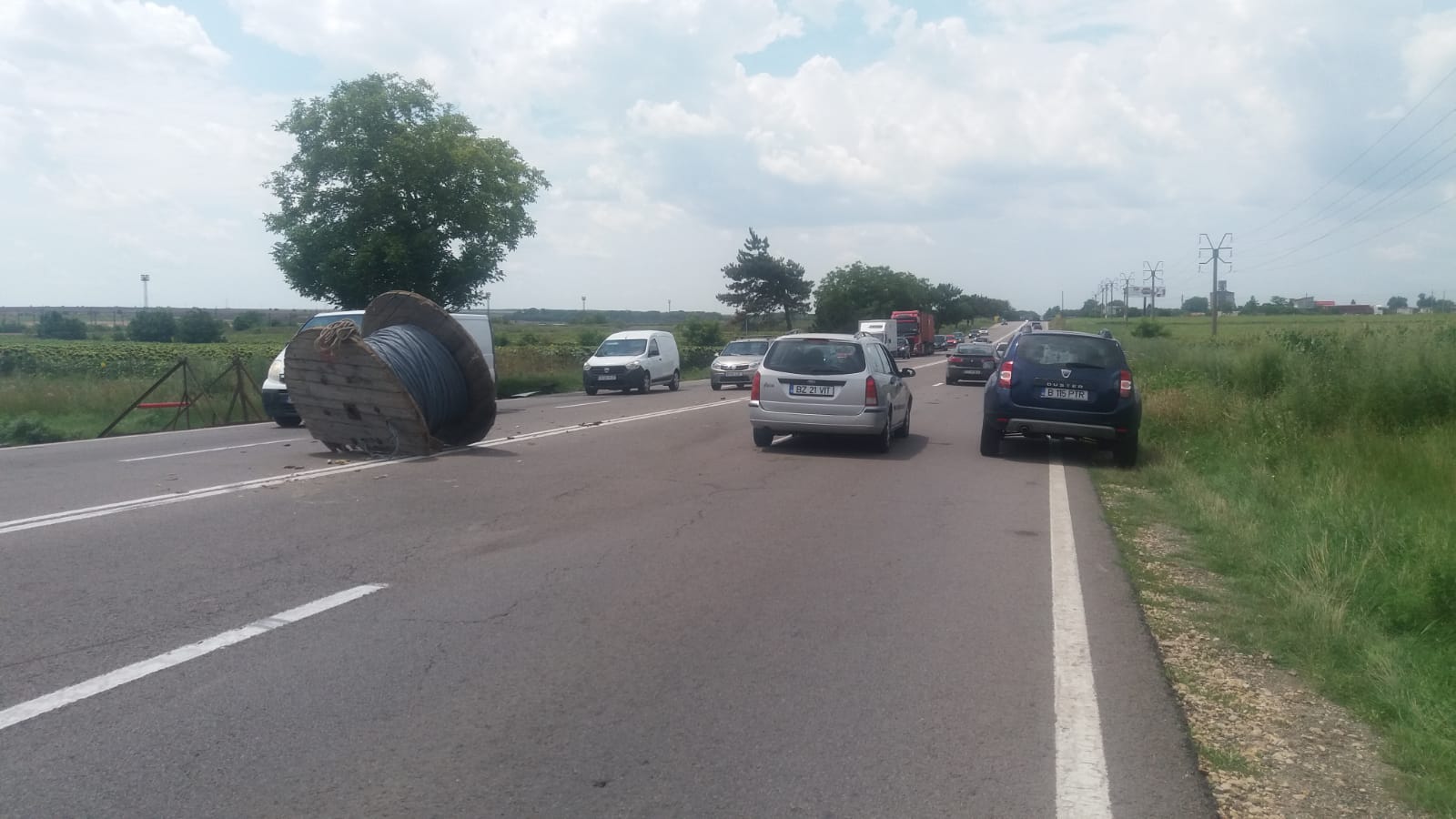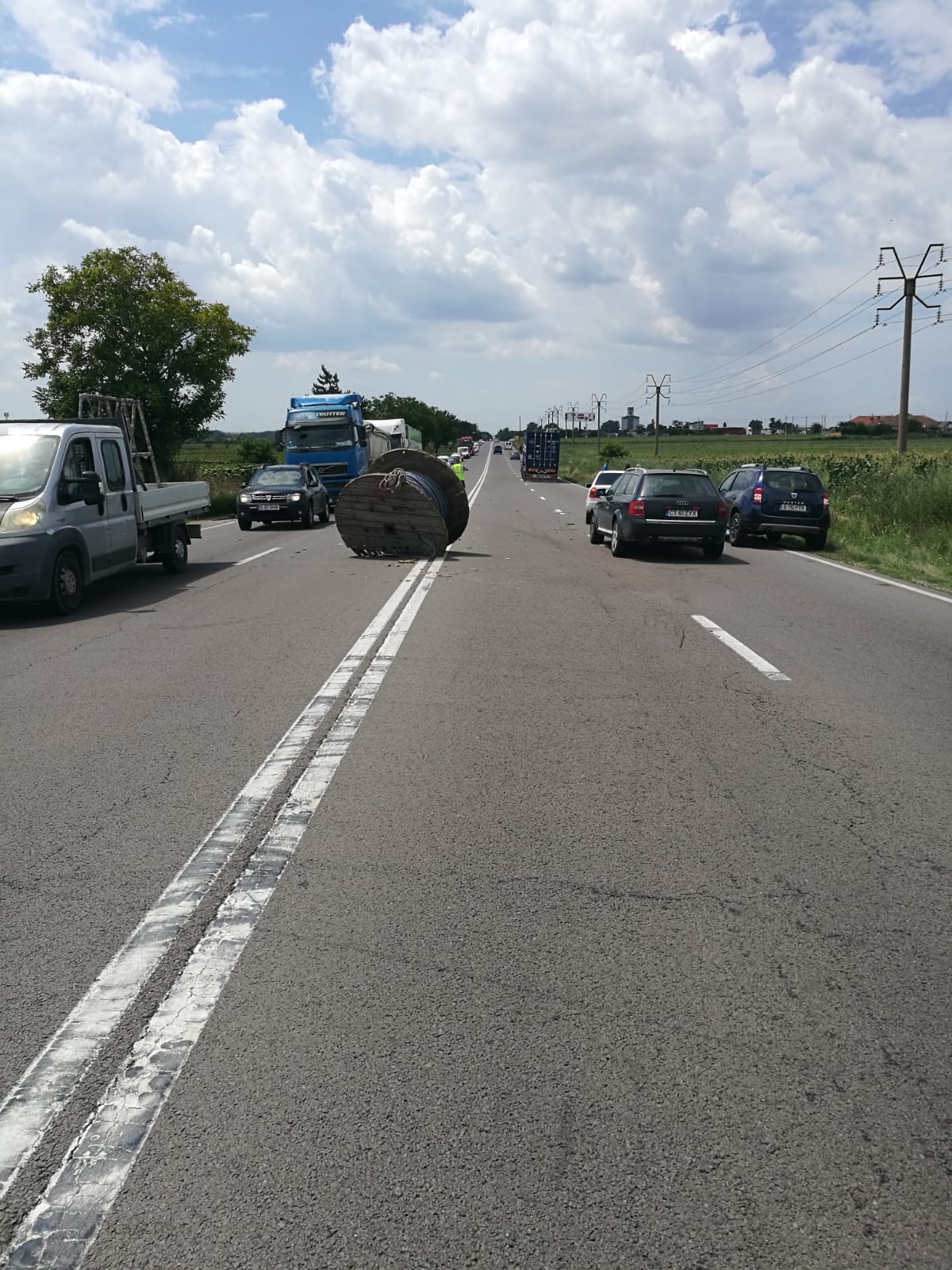 Tot în urma impactului, un tambur de cablu, cu o greutate de peste o tonă, a căzut din remorca autoutilitare, pe șosea, fiind la un pas să cadă peste o altă mașină.