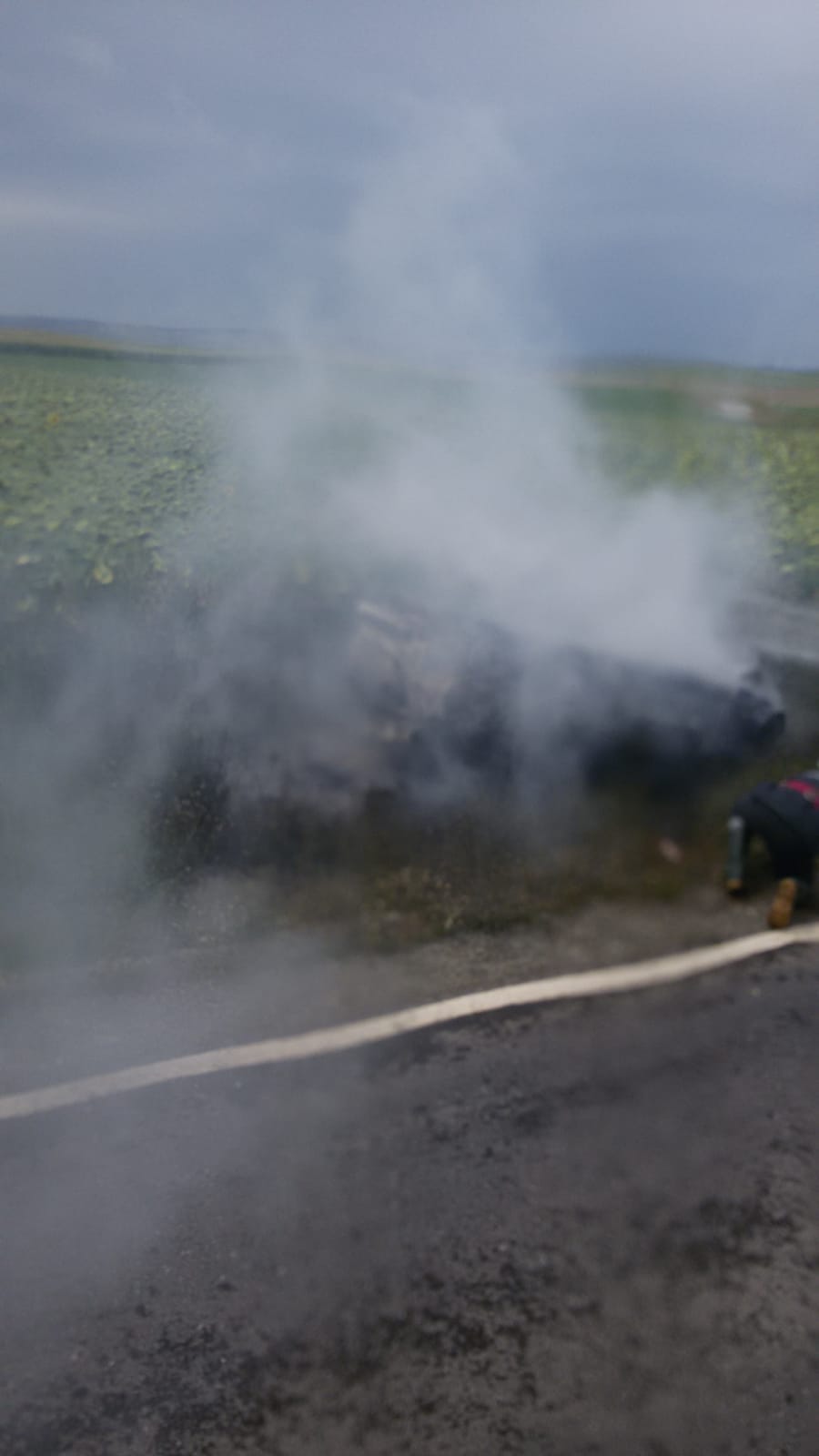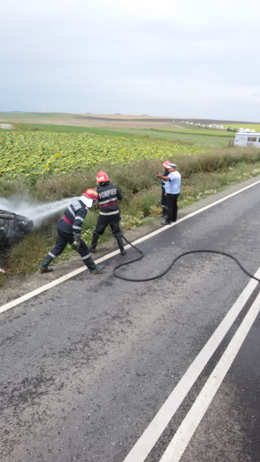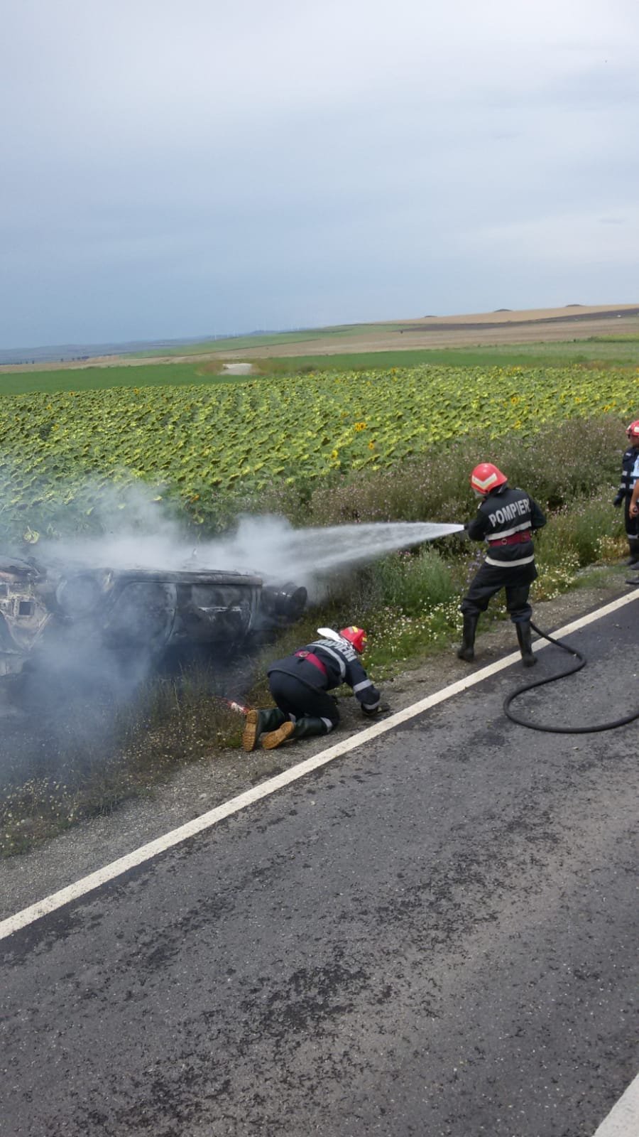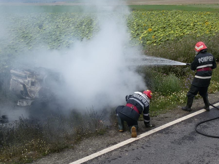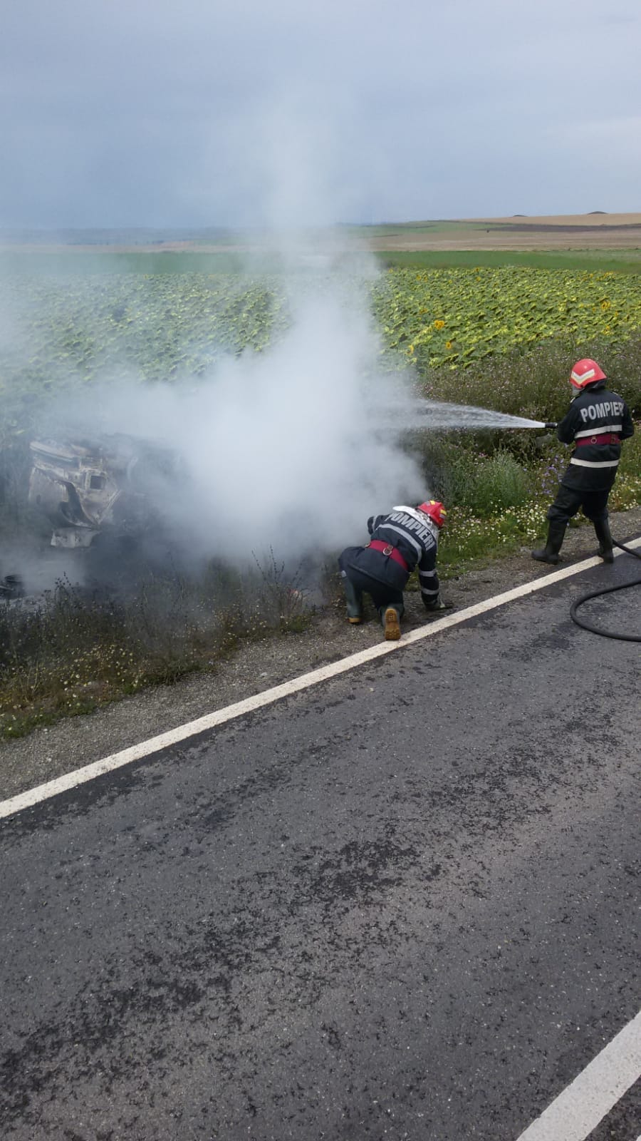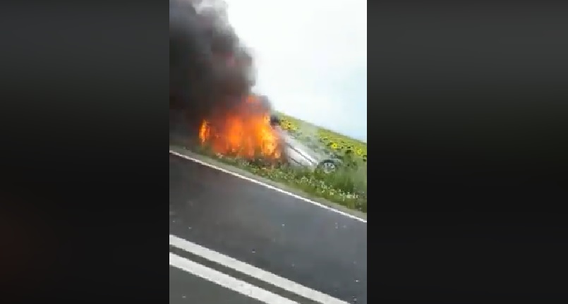 VIDEO/FOTO – Județul TULCEA: Mașină cuprinsă de flăcări pe DN 22. Două persoane au ajuns la spital