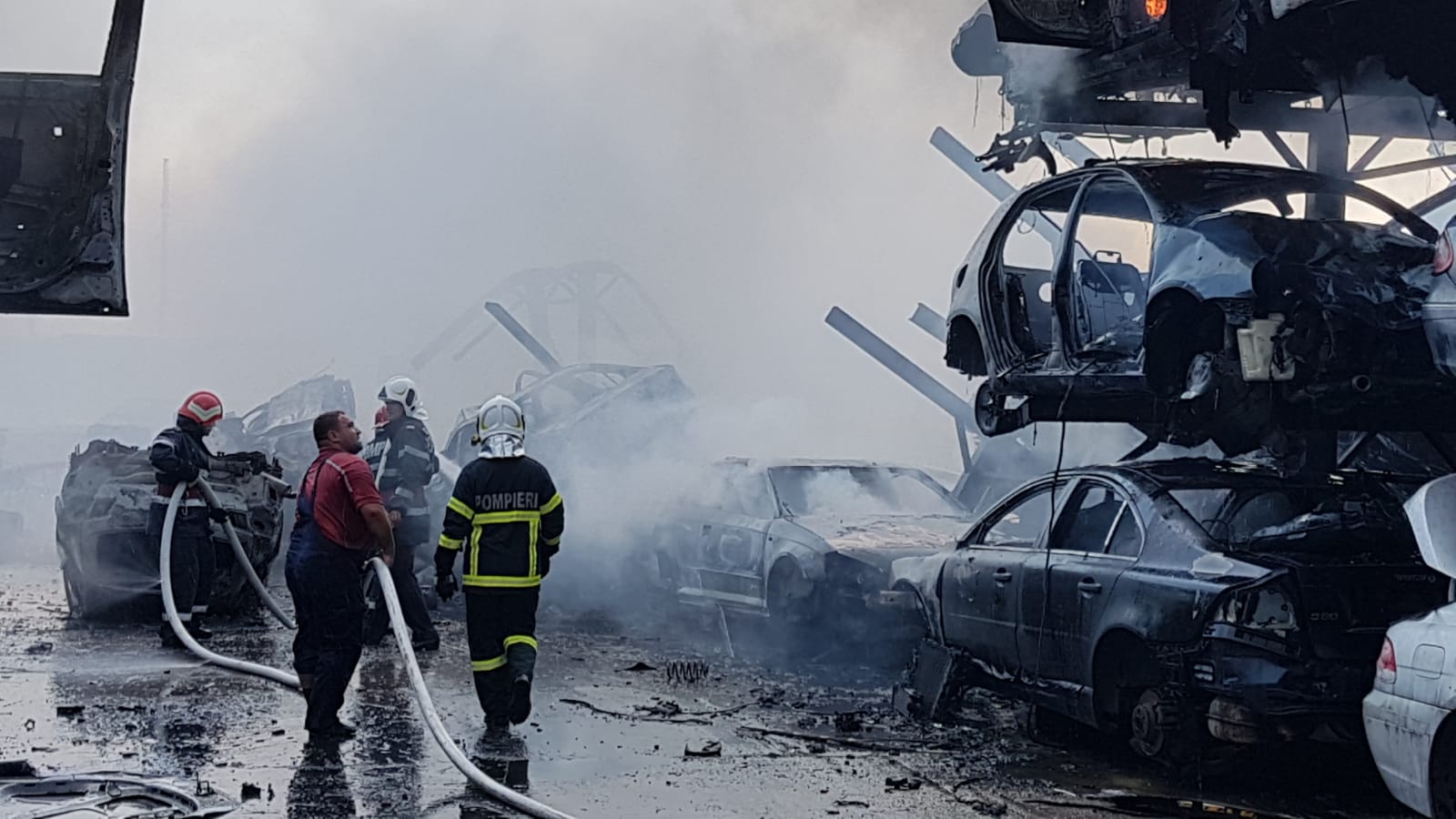 Peste 40 de autoturisme depozitate în curtea centrului de dezmembrări au fost distruse de flăcări, în urma incendiului violent de astăzi. Intervenţia pompierilor a durat două ore şi jumătate, timp care salvatorii au reușit să limiteze focarul la o suprafață de 300 de metri pătrați, reușind să prevină flăcările să se extindă la întreaga suprafață a parcului auto.