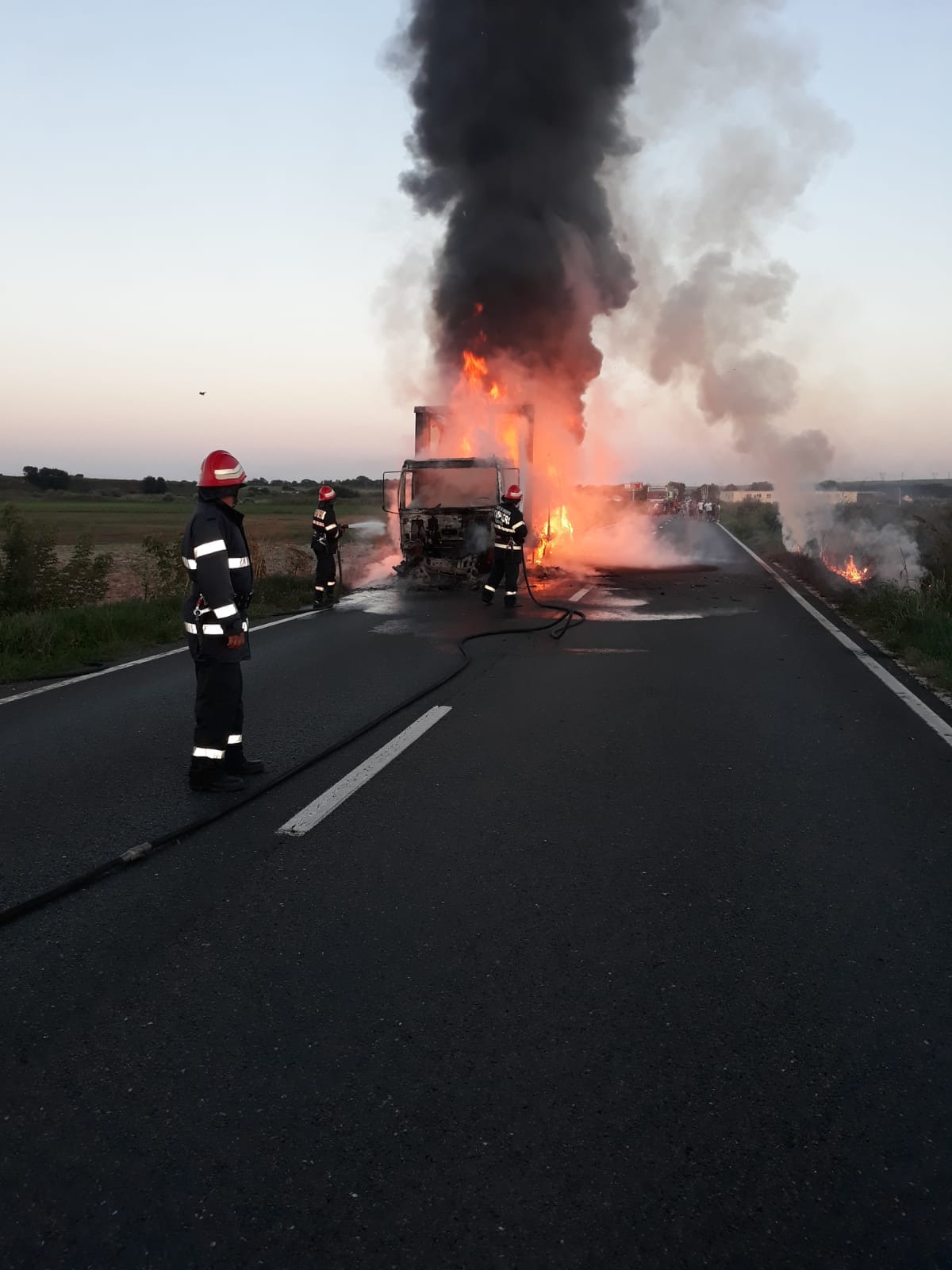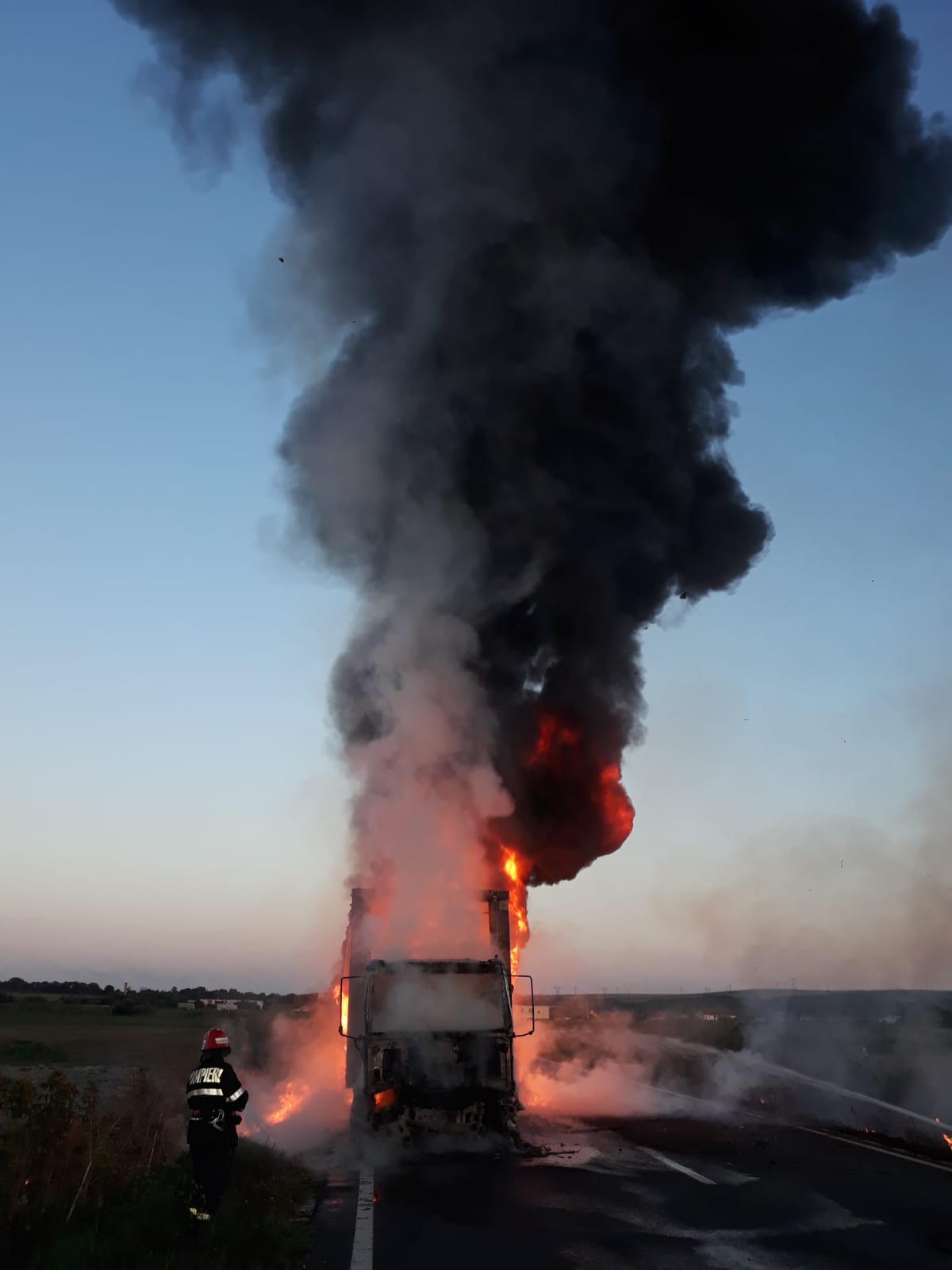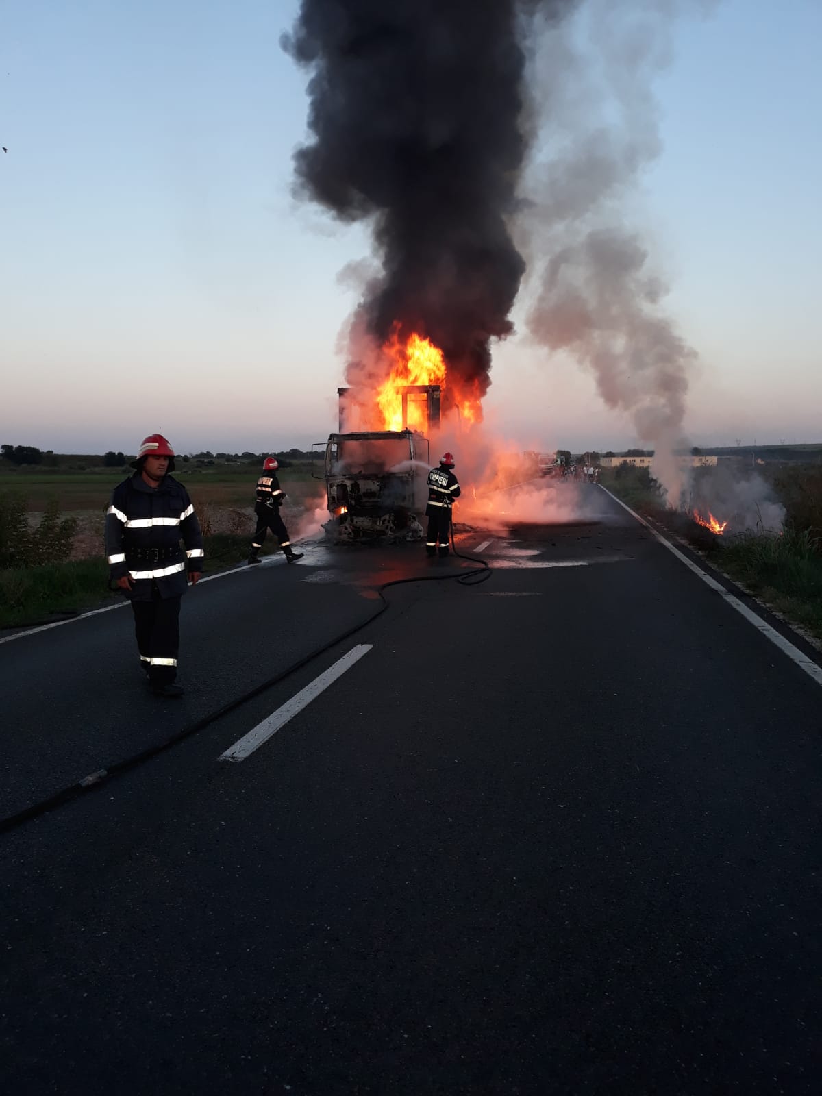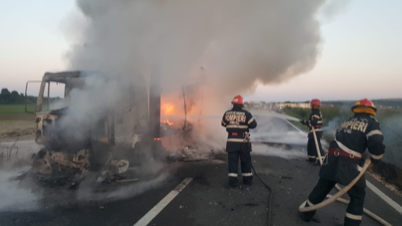 12 pompieri cu două autospeciale de stingere au intervenit seara trecută, pentru lichidarea unui incendiu izbucnit la un autocamion aflat în mers, între localitățile Mircea Vodă și Faclia.