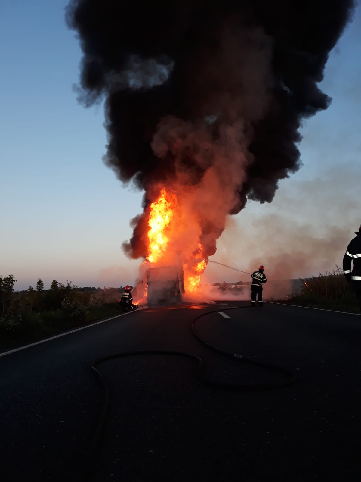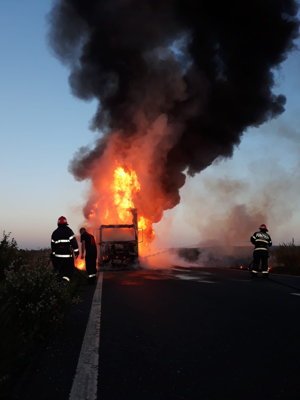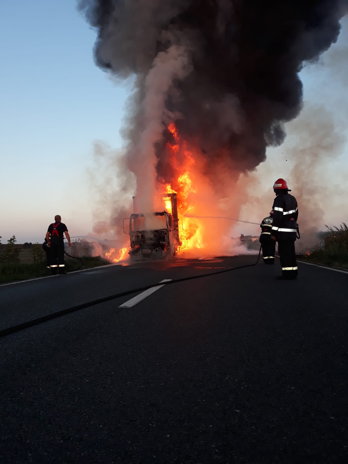 12 pompieri cu două autospeciale de stingere au intervenit seara trecută, pentru lichidarea unui incendiu izbucnit la un autocamion aflat în mers, între localitățile Mircea Vodă și Faclia.