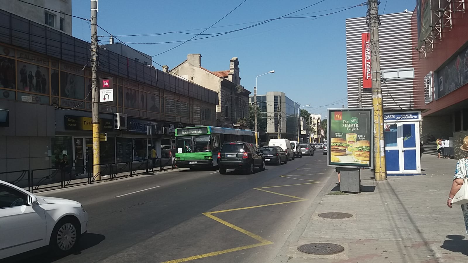 Pe sensul de mers spre Galeriile Soveja, autobuzele intră pe străzile Constantin Brătescu și Ion Gheorghe Duca.