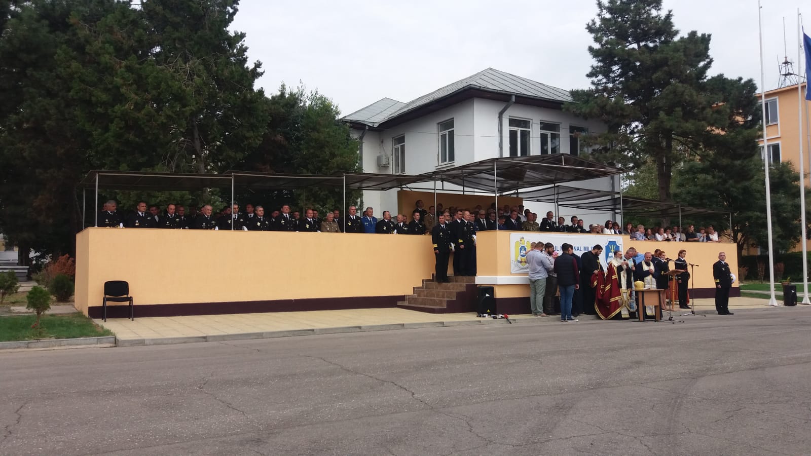 Ceremonia de astăzi, care nu s-a ținut la sediul Colegiului Militar de Marină, ci la Academia Navală, a fost marcată, tradițional, și printr-o slujbă religioasă, oficiată de IPS Teodosie Arhiepiscopul Tomisului.