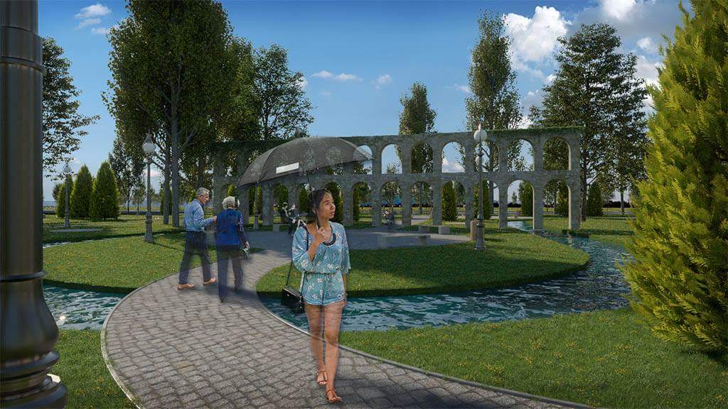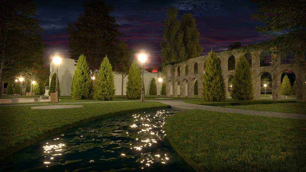 Aleea de vizitare se va intersecta cu un circuit de cu aspect de apă curgătoare, sub forma unui canal cu lăţimea de 2.5 m, cu rol peisagistic. În zonele de intersecţie se vor amenaja podeţe mărginite de balustrade metalice. Pe timpul nopţii, circuitul va fi iluminat cu spoturi amplasate în pereţii canalului.