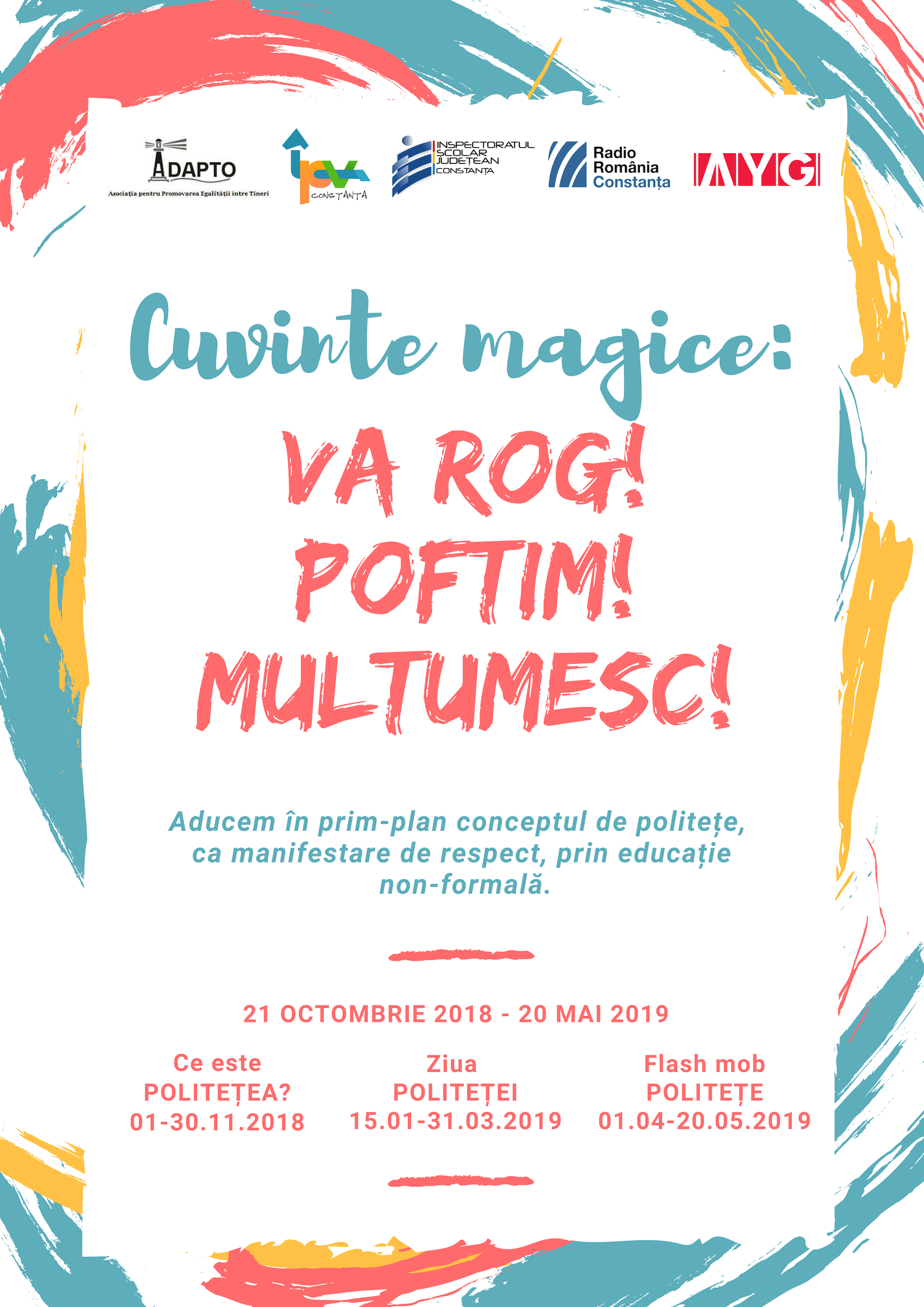 Asociaţia pentru Promovarea Egalităţii între Tineri ADAPTO şi Asociaţia Împreună pentru Viitor Constanţa derulează proiectul „Cuvinte magice: VĂ ROG! POFTIM! MULȚUMESC!”, în perioada 01 noiembrie 2018 – 31 mai 2019.