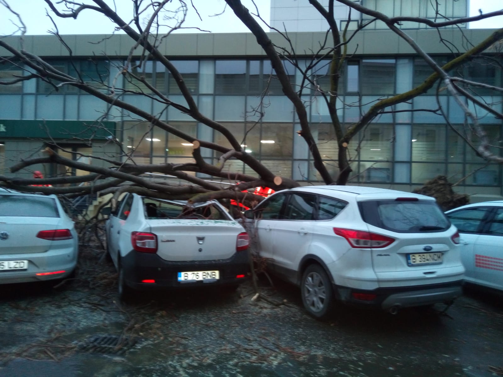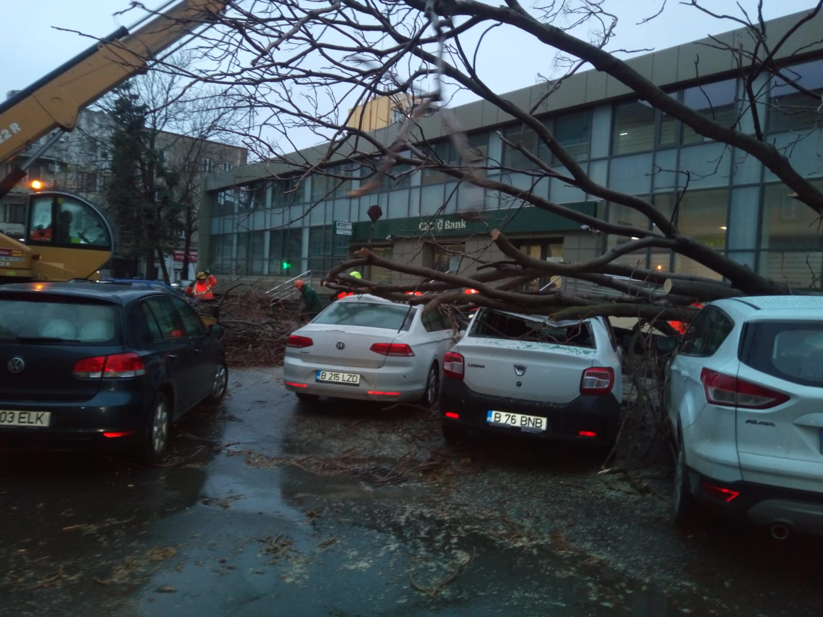 Mai multe mașini au fost avariate după ce un copac a fost doborât.