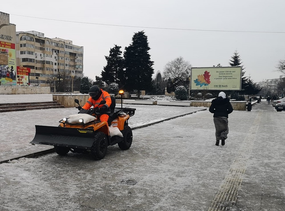 Primăria Municipiului Constanța continuă acțiunile de deszăpezire pe trotuarele din oraș. Miercuri, utilajele de mici dimensiuni au împrăștiat material antiderapant pe spațiile destinate pietonilor și în stațiile de transport în comun.