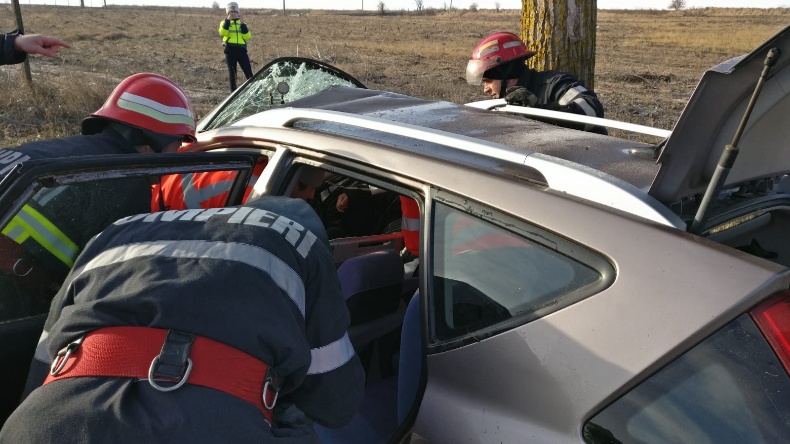 S-a intervenit cu o autospecială de stingere cu apă și spumă și modul de descarcerare și 6 subofițeri.