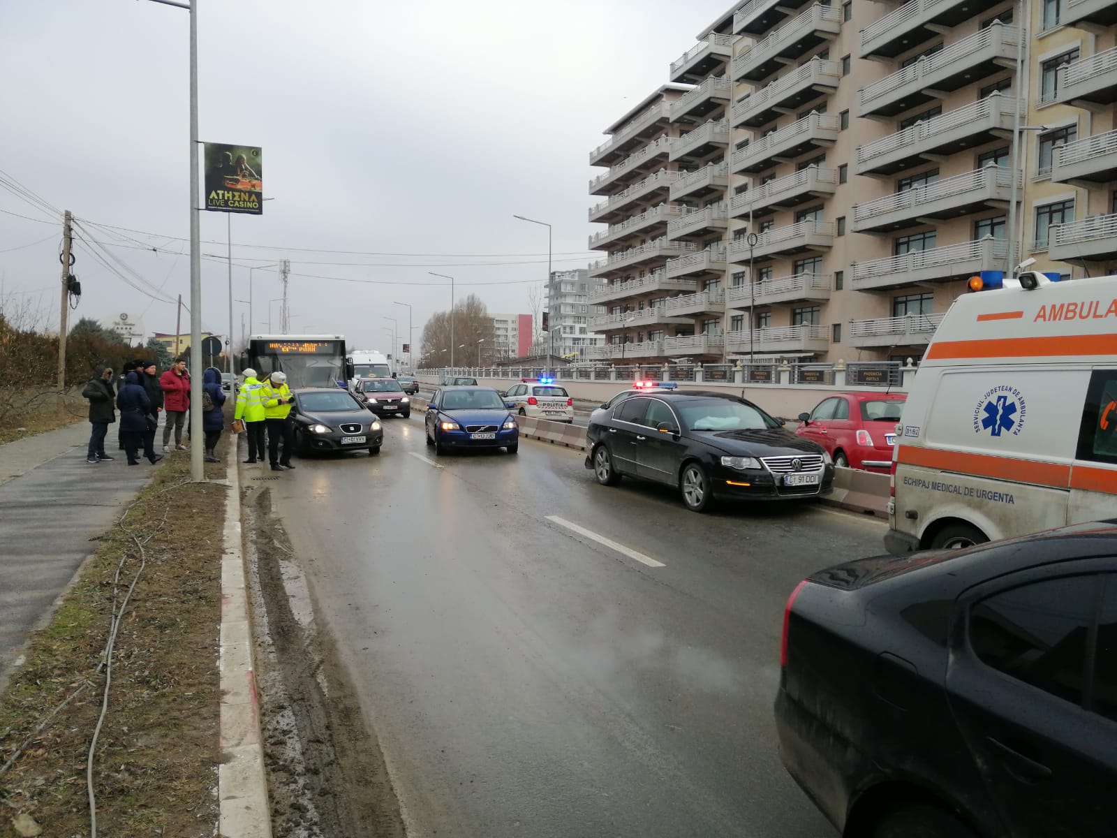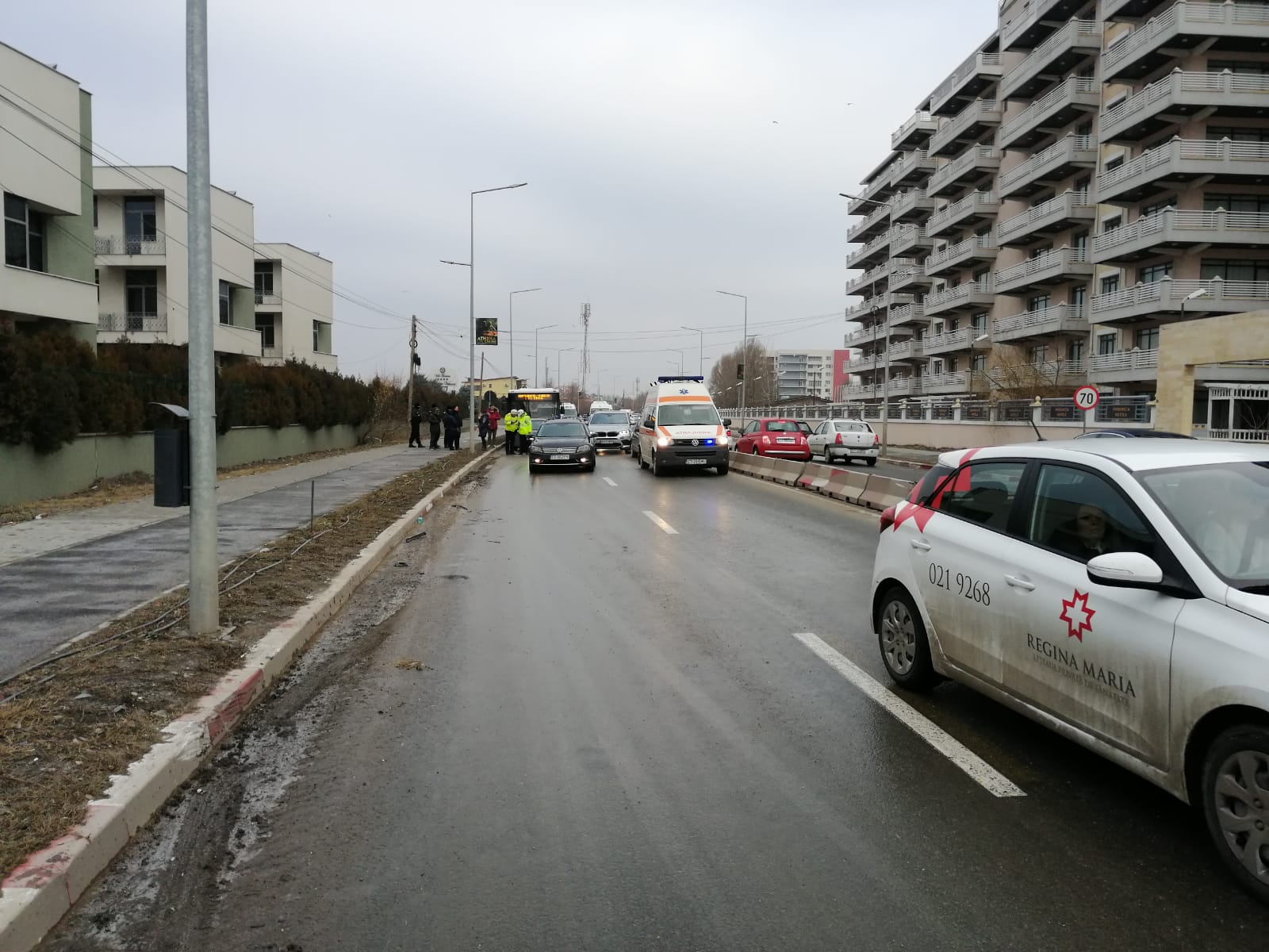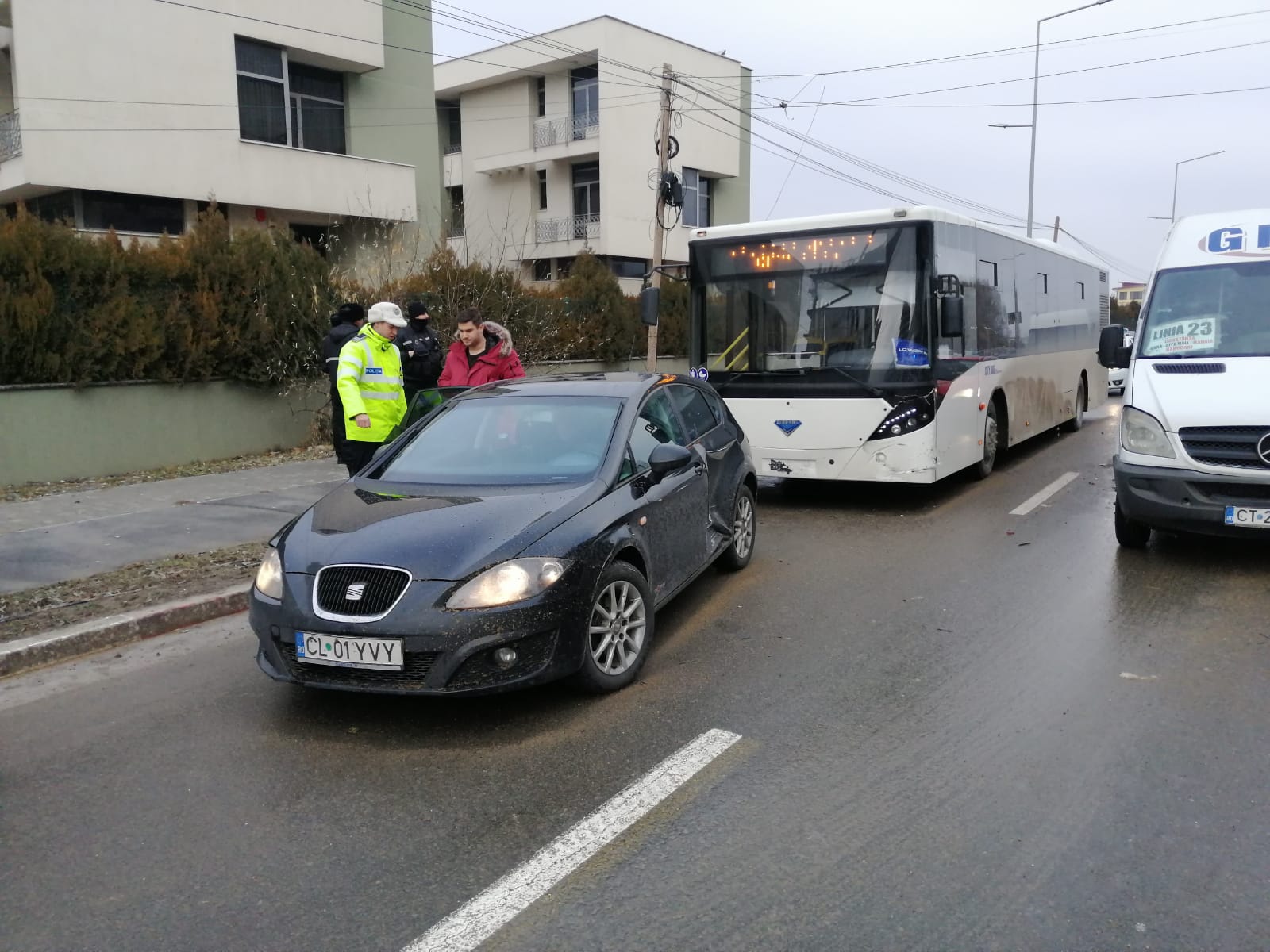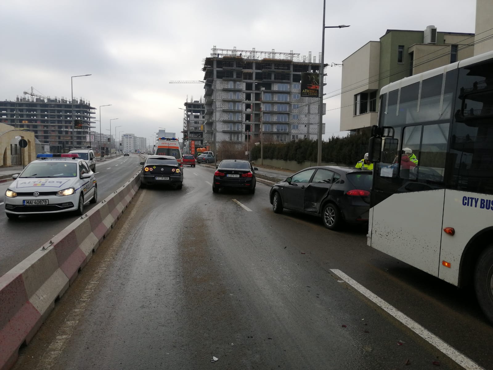 „În jurul orei 8.50, un bărbat de 63 de ani a condus un autoturism pe DC 86 dinspre Năvodari către Constanța, iar la un moment dat a pierdut controlul volanului din cauza neadaptării vitezei la condițiile de drum, a acroșat un autoturism condus de o femeie de 27 de ani și un alt autoturism condus de o femeie de 21 de ani. După producerea accidentului, unul dintre autoturisme a fost acroșat și de un autovehicul transport persoane, condus de un bărbat de 51 de ani“, a transmis IPJ Constanța.