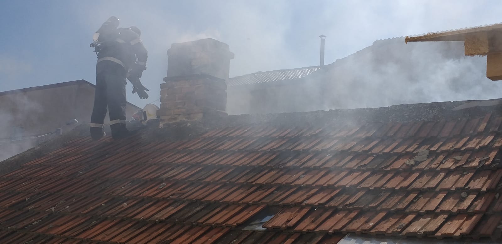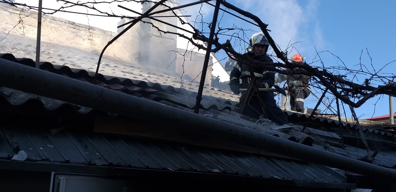 Pompierii intervin pentru limitarea efectelor focului care a cuprins casa.