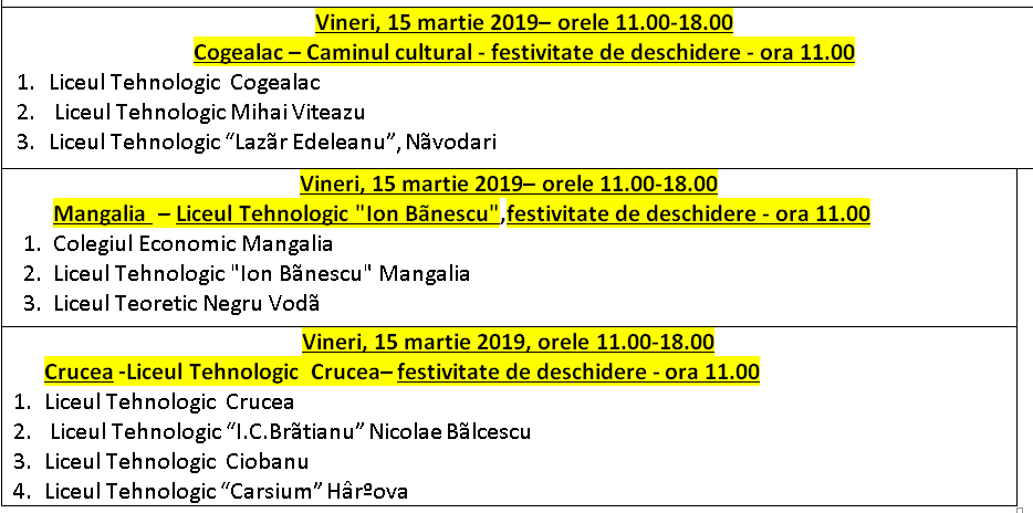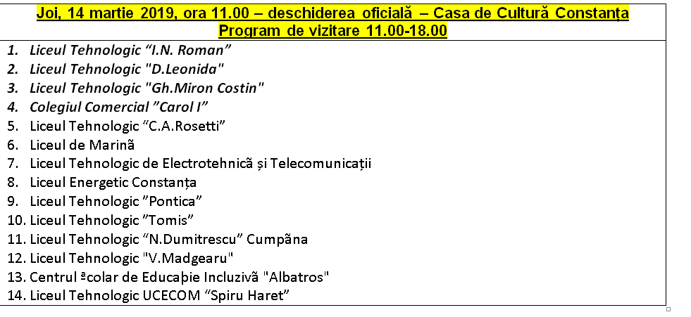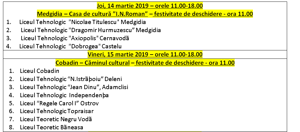 Cele 36 de unităţi şcolare cu învăţământ professional si dual, împreună cu operatorii economici-parteneri, îşi vor expune oferta de formare între orele 11.00 și 18.00, în zilele de 14 și 15 martie la Casa de Cultură din Constanța și în cele cinci locații din județ: Medgidia, Cobadin, Crucea, Cogealac și Mangalia.