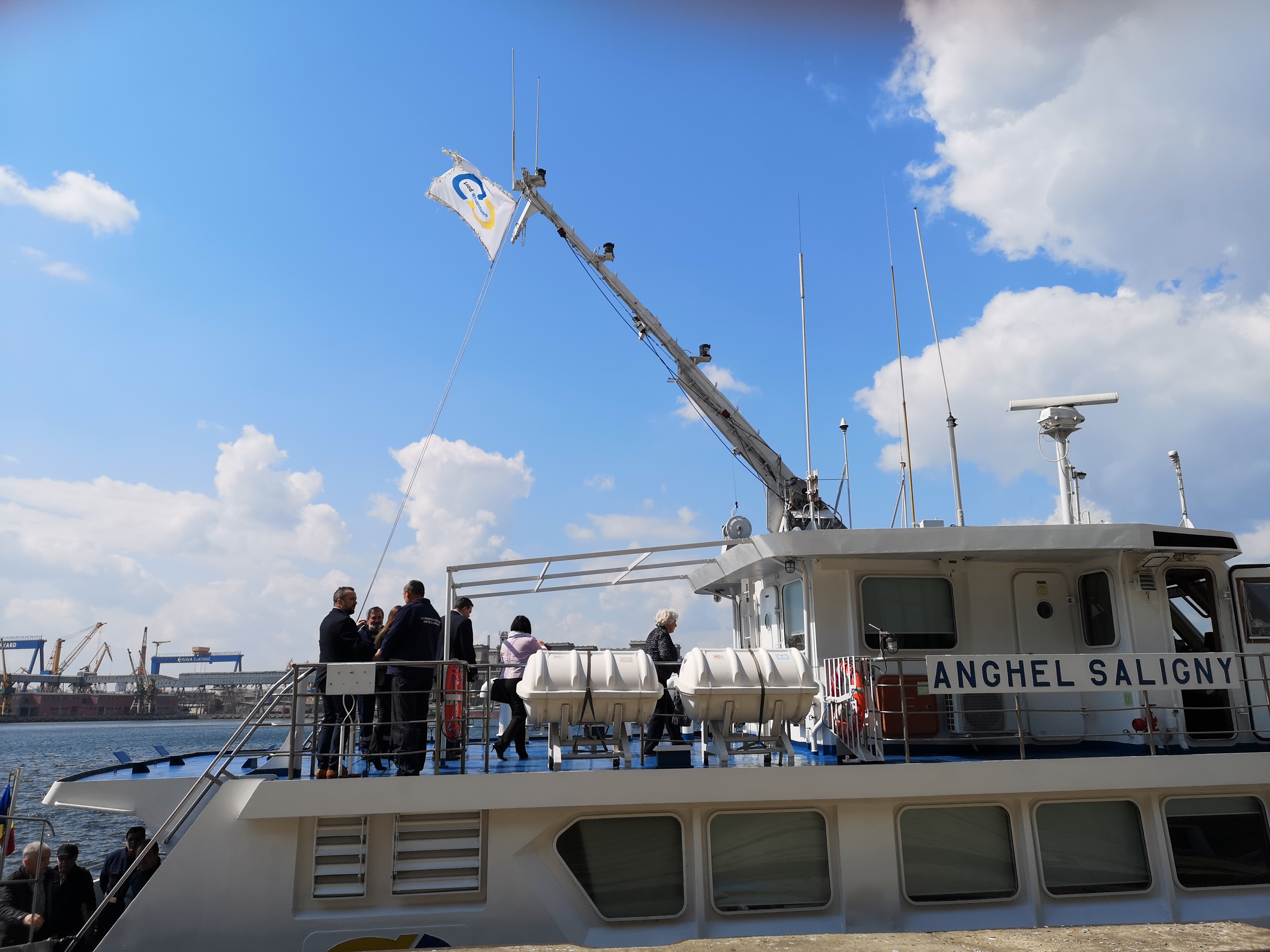 Delegația a vizitat Portul Constanța, la bordul navei Anghel Saligny, un obiectiv fiind sistemul de semnalizare din bazinele portuare și de pe calea navigabilă, modernizat în cadrul proiectului PROTECT.