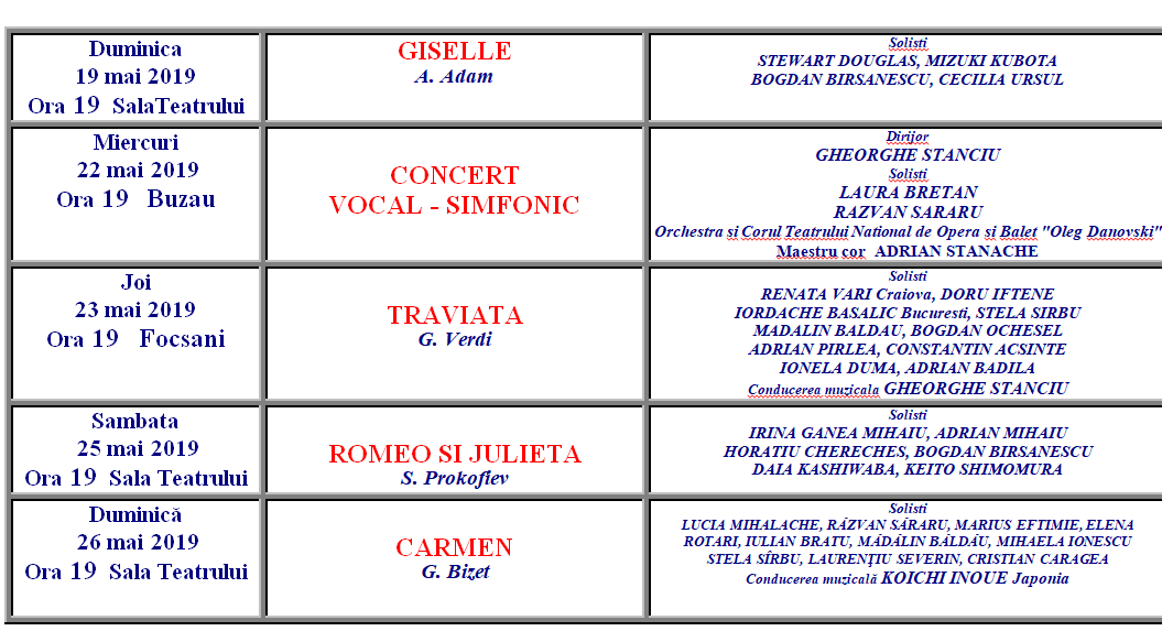 Teatrul Naţional de Operă şi Balet « Oleg Danovski » informează că, din cauza îmbolnăvirii unui interpret, spectacolul „Forţa Destinului” de G. Verdi, programat în data de 26.05.2019, va fi înlocuit cu spectacolul „Carmen”, de G. Bizet.