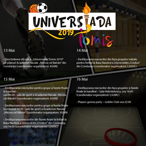 În cadrul evenimentului, peste 150 de sportivi se vor întrece în competiții de fotbal, handbal, baschet și volei,(masculin și feminin) iar meciurile se vor desfășura la baza nautică a Universității Ovidius, la Sala Hidrotehnică a Universității Maritime și în sala de sport a Academiei Navale „Mircea cel Bătrân”.